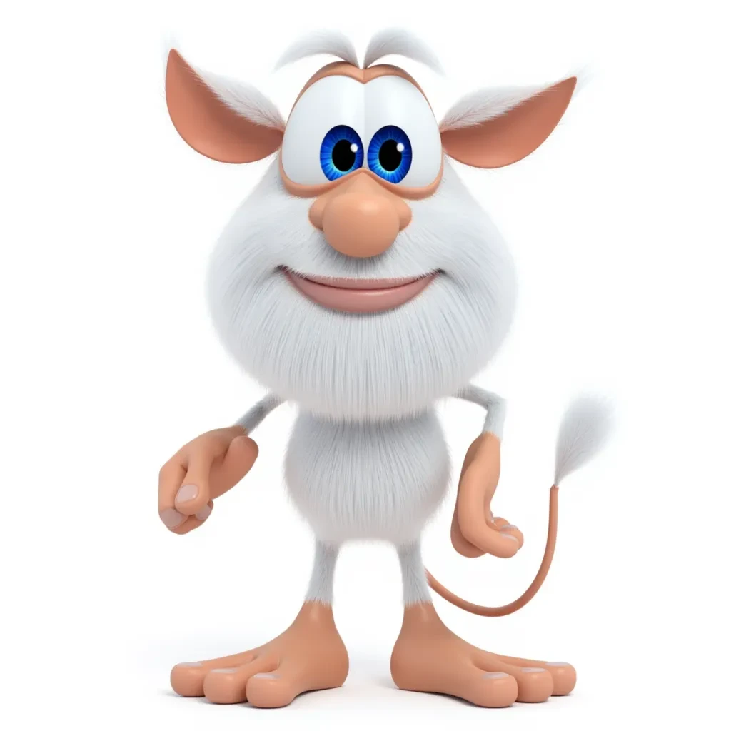Booba 3D, white body fur, white beard and hair, big blue eyes, prominent nose, wide ears, long tail, hands with 4 fingers, feet with 3 toes, beige body