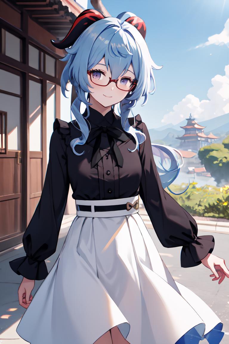 Prompts: ganyu \(china merchants bank\) \(genshin impact\), long hair, frilled shirt, black shirt, white skirt, high-waist skirt, black ribbon, semi-rimless eyewear, low ponytail, long sleeves, pantyhose