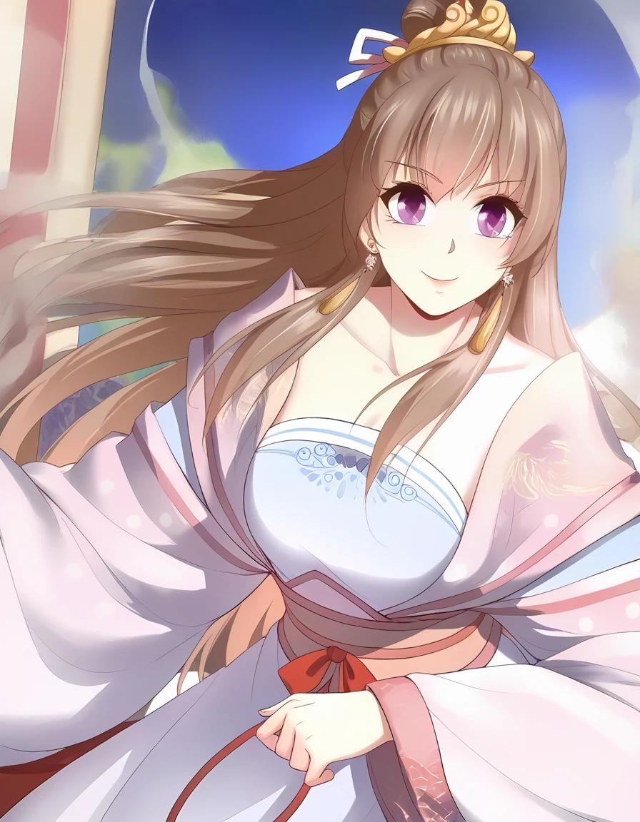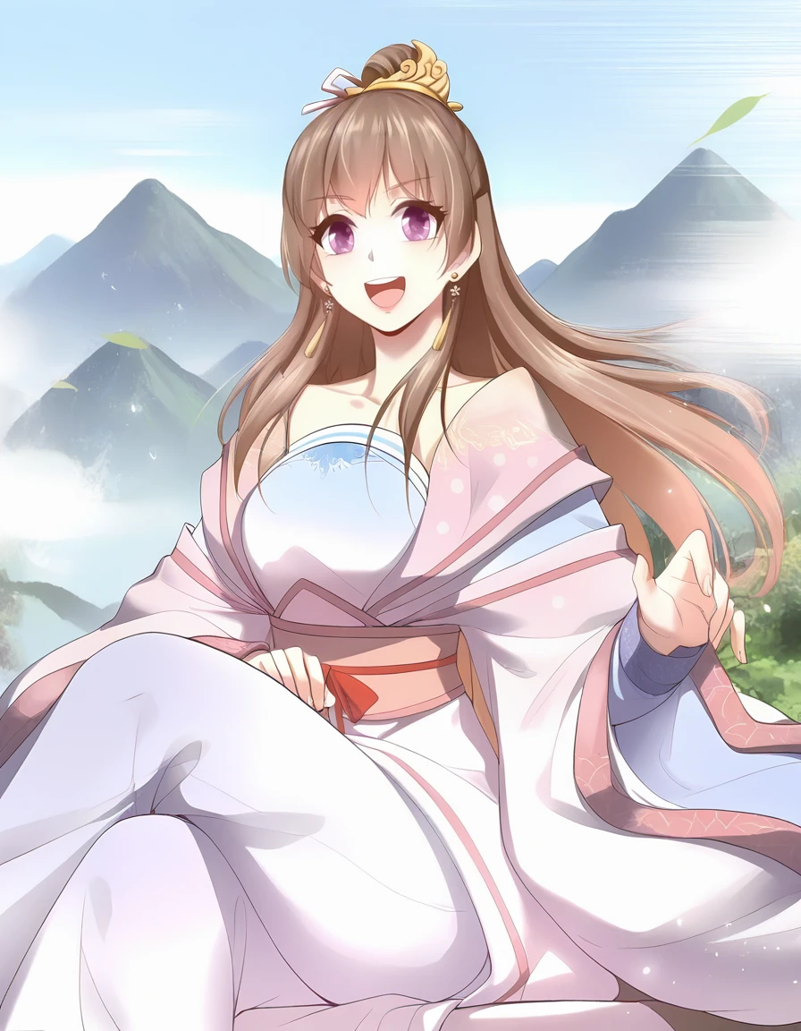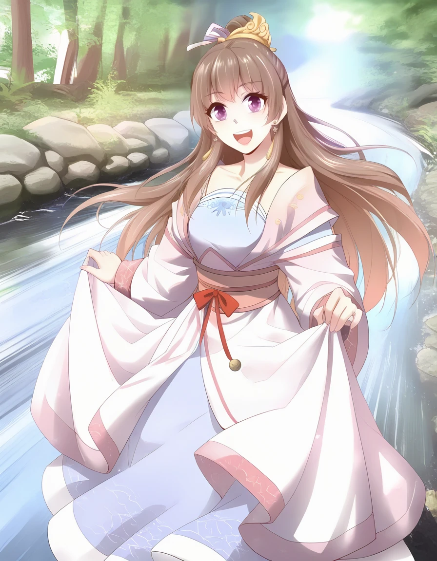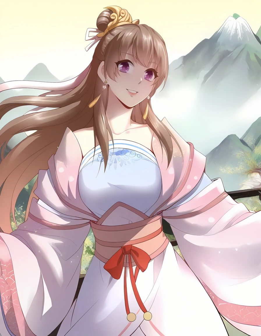 YE JIA YAO,1girl,long hair,brown hair,earrings,jewelry,hanfu,purple eyes,dress,chinese clothes,hair ornament,