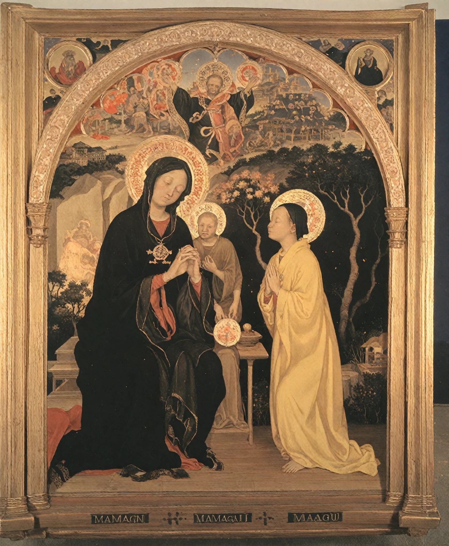 '<name of painting>' by FabrianoGentileda in <year>, <genre(s)>, International Gothic \(style\), <tags>