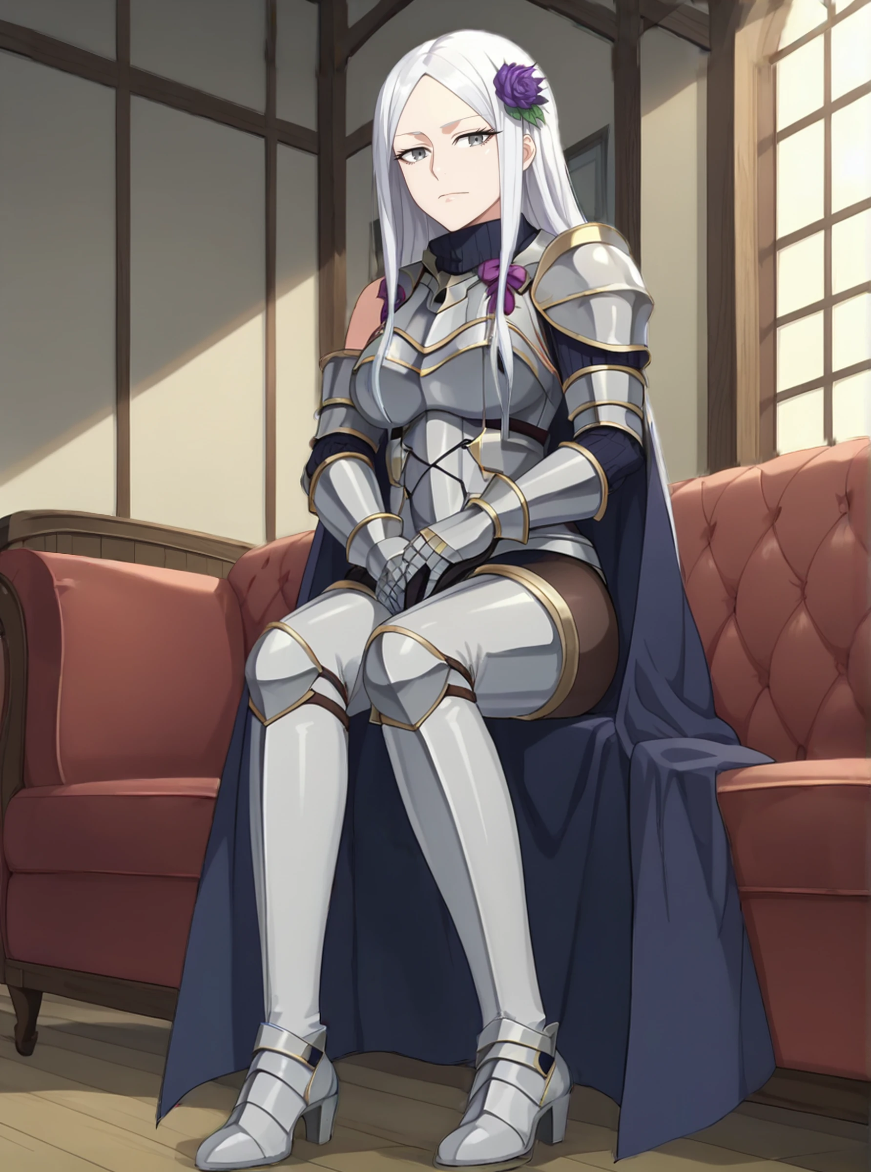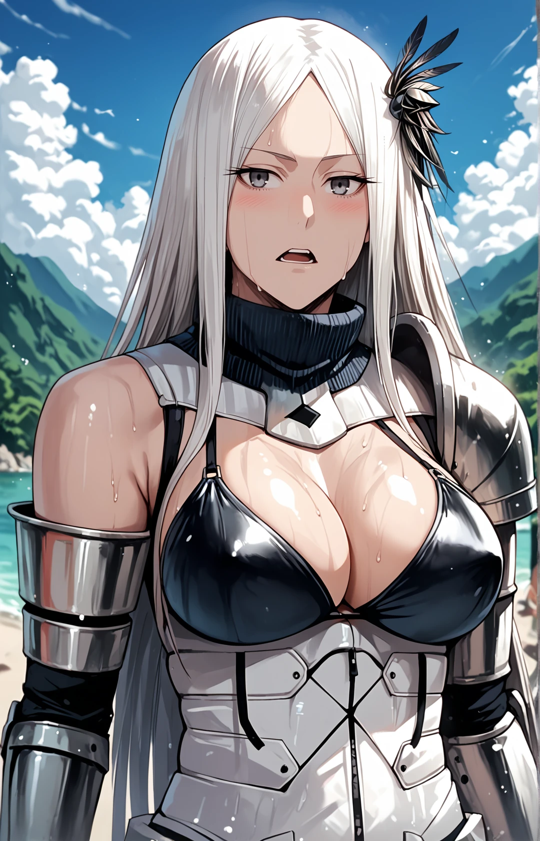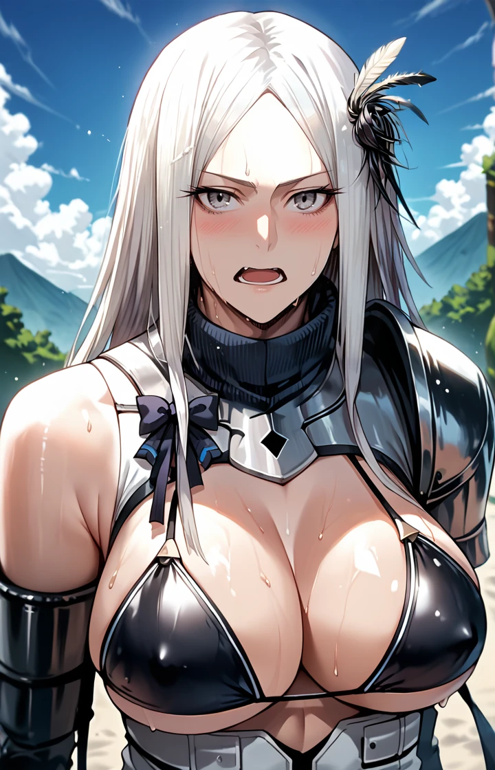 ,Silver eyes, white hair, parted bangs, long hair, Full body armor