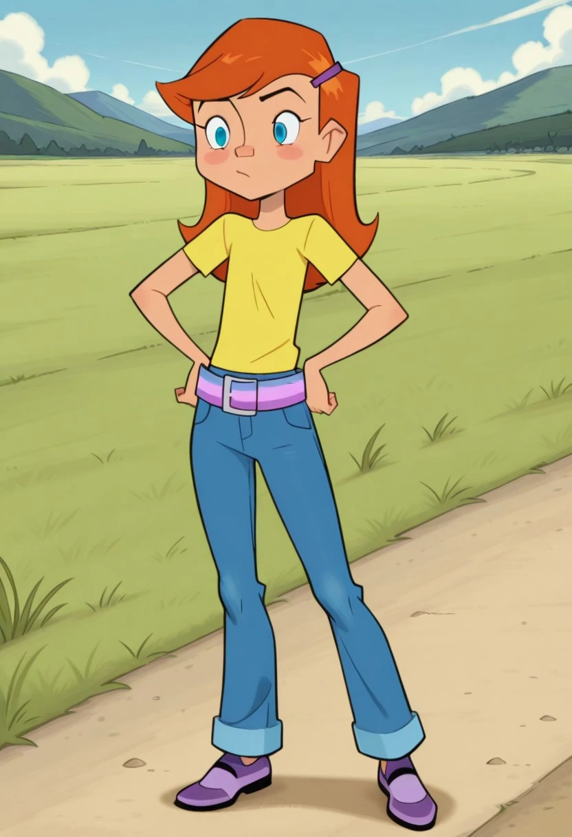 Riley Daring, fair skin, rosy cheeks, purple hairclip, waist-length ginger-orange hair, teal eyes, yellow shirt, blue jeans, purple belt,