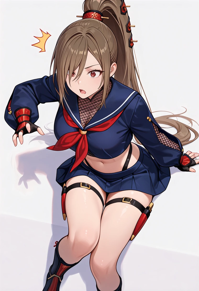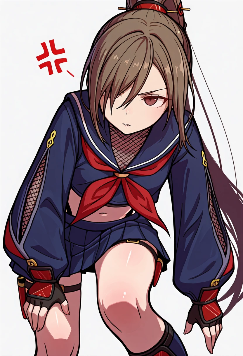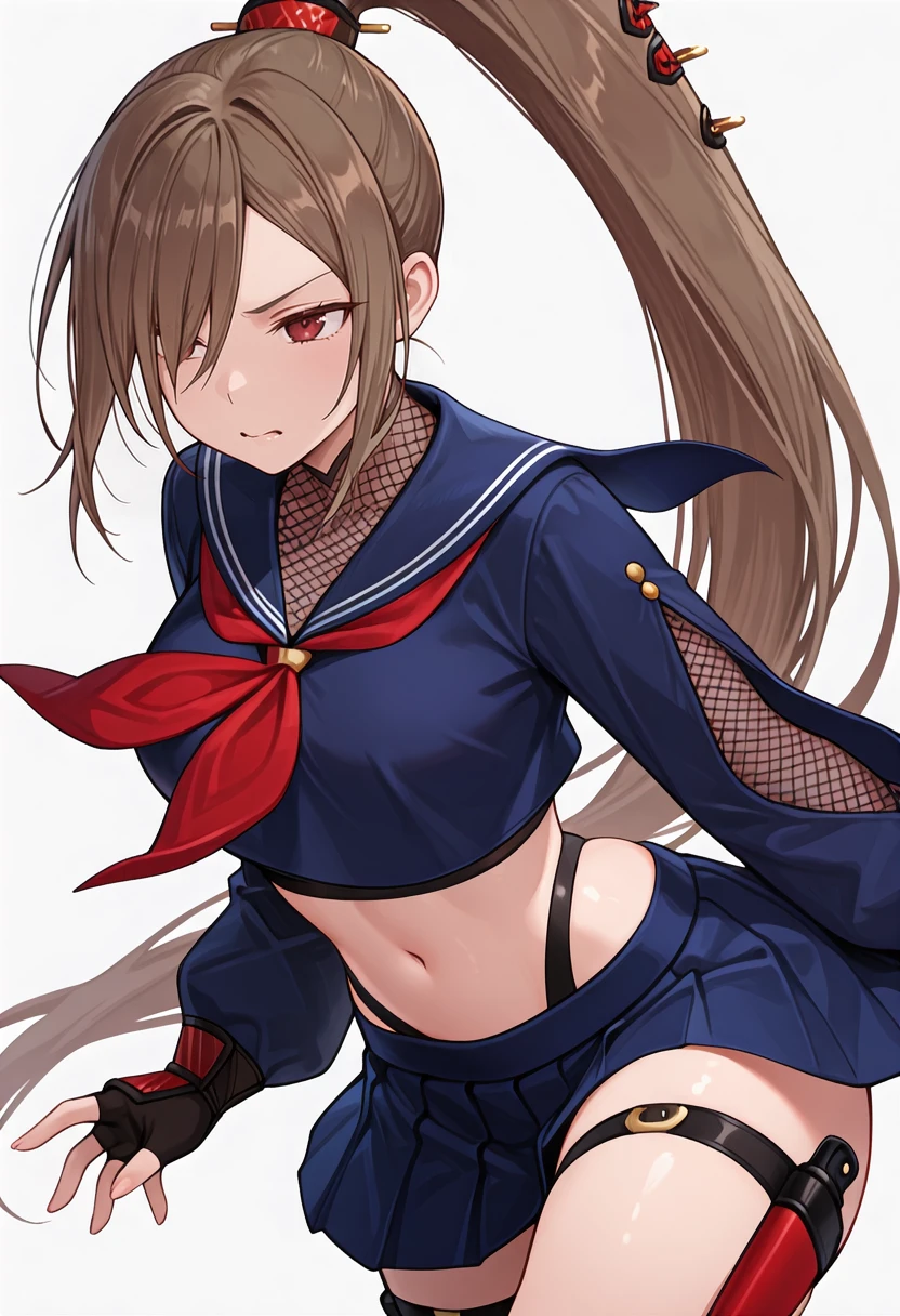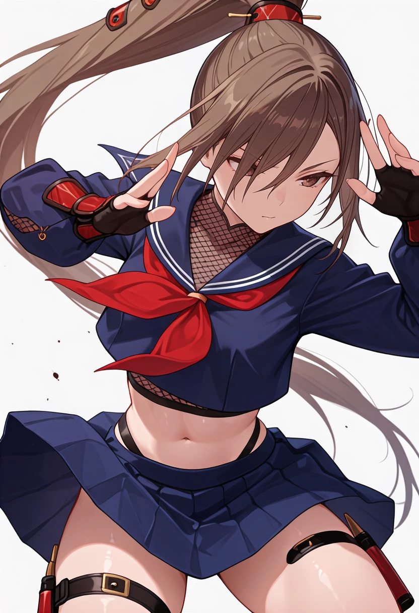 yui_cnr, 1girl,brown hair, brown eyes, red eyes, high ponytail, very long hair, hair over one eye, hair ornament, ninja,