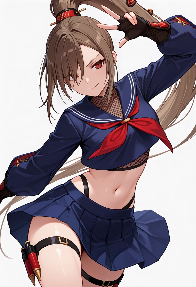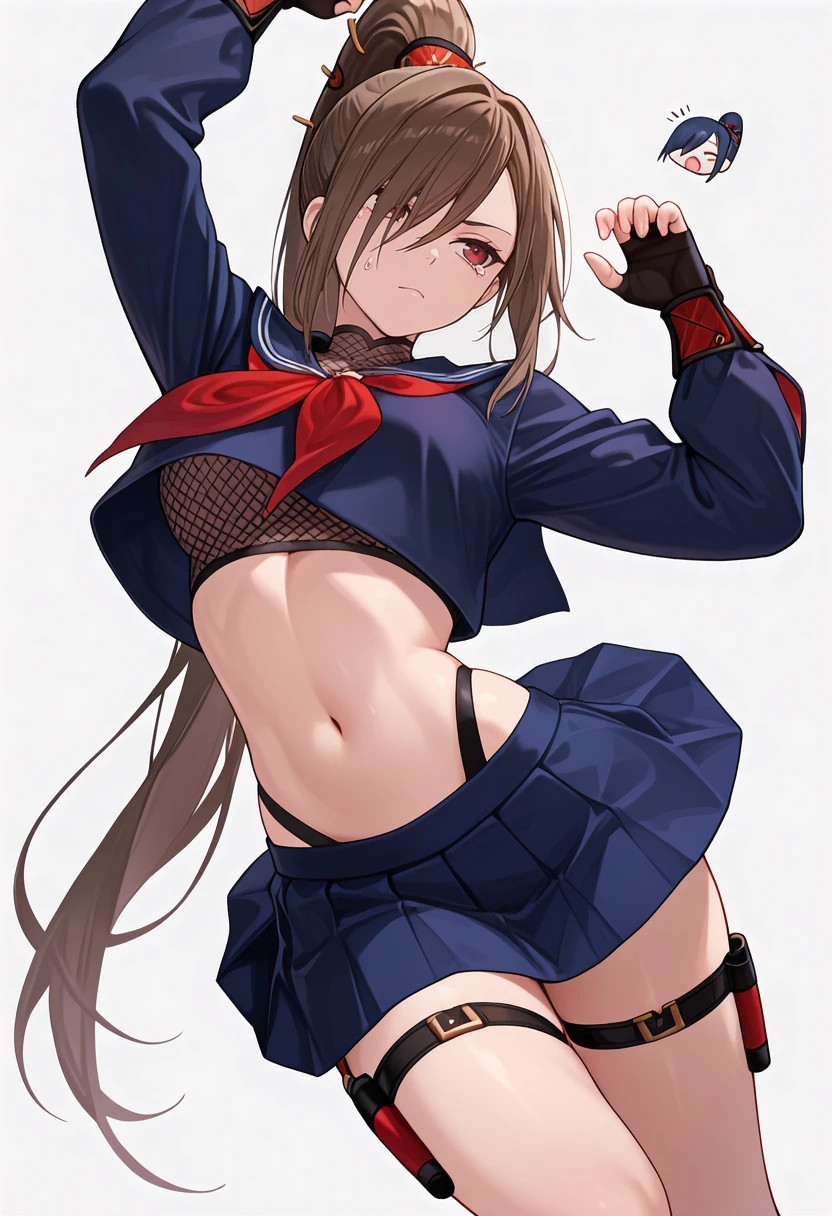 school uniform,fishnets, midriff,navel,highleg panties, long sleeves, crop top, red neckerchief, blue skirt, fingerless gloves, thigh strap, thigh holster,