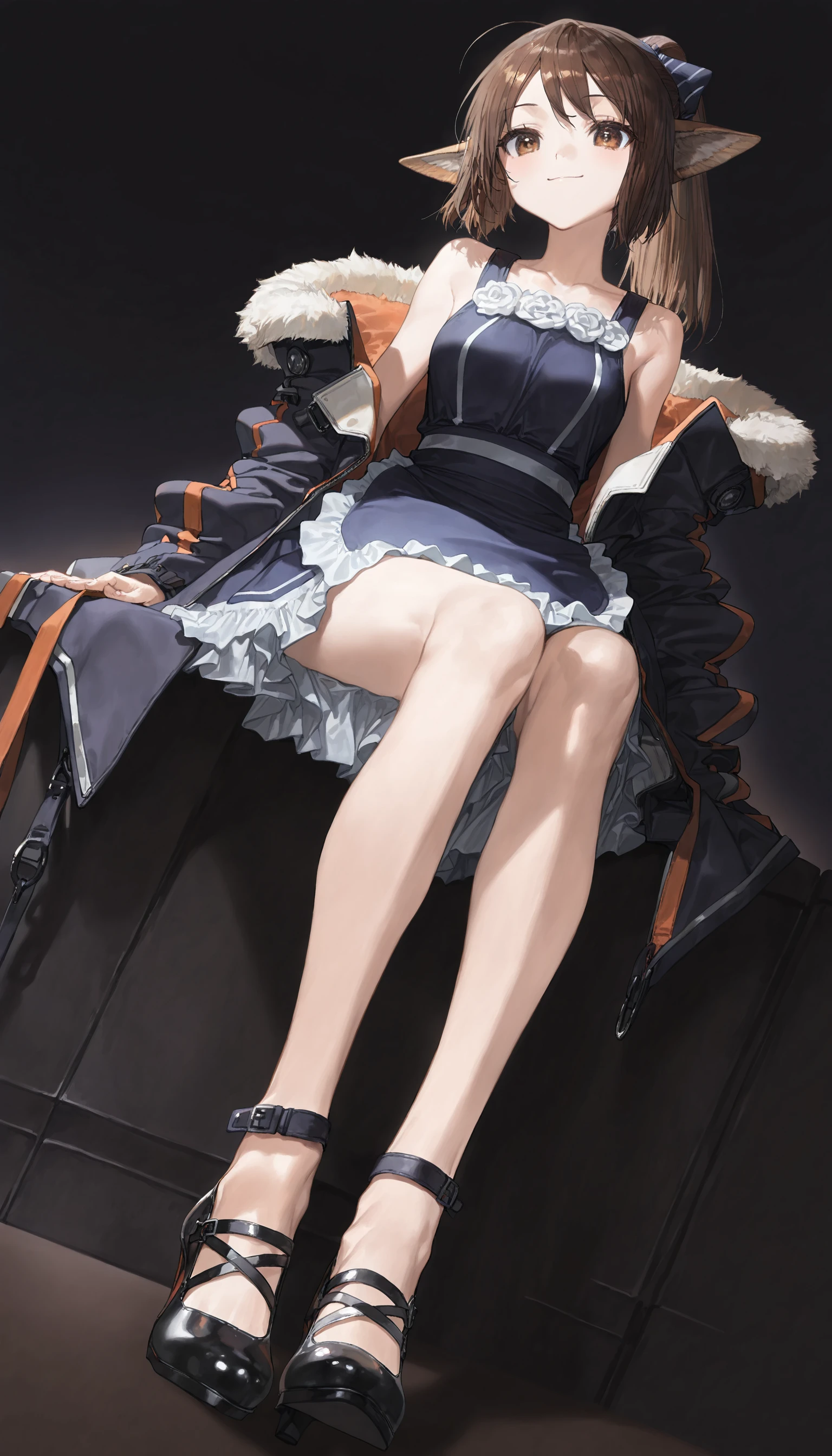 perfumer_\(arknights\), brown hair , ponytail , hair bow , brown eyes , open jacket, fur-trimmed jacket , sleeveless dress , blue apron, high heels ,