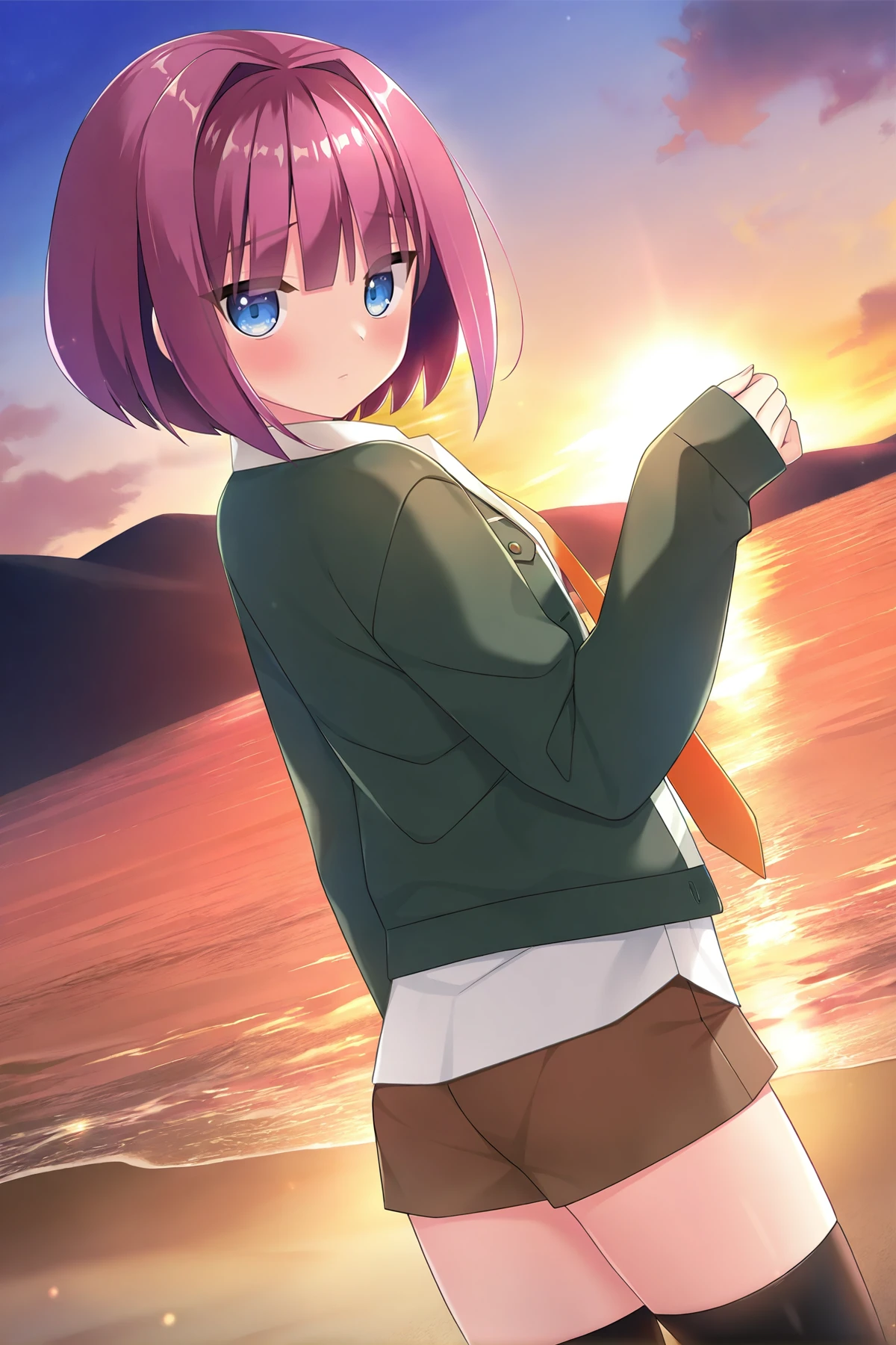 常服:nana date, purple hair, sleeves past wrists, collared shirt, white shirt, jacket, green jacket, open clothes, open jacket, necktie, orange necktie, short shorts, shorts, brown shorts, black thighhighs, thighhighs, boots