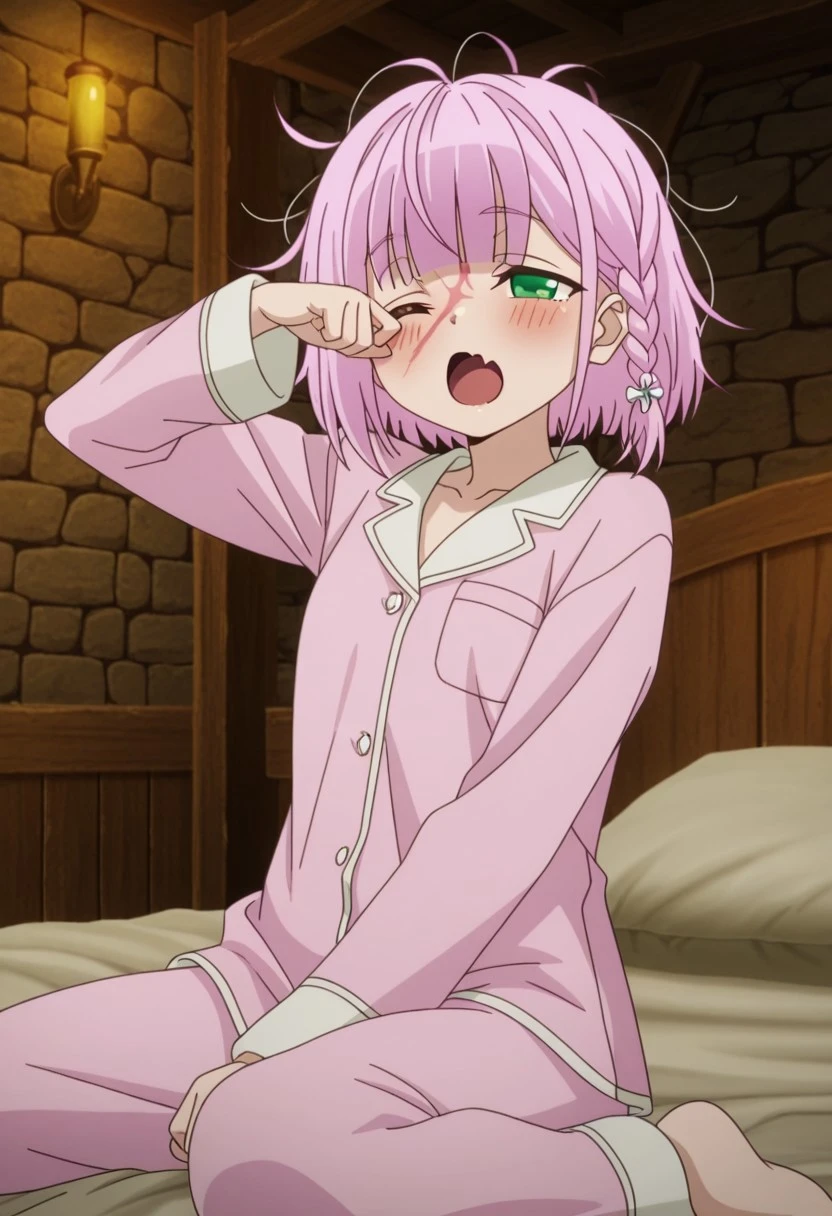 short hair, pink hair, side braid, green eyes, scar, armor, shorts, thigh boots