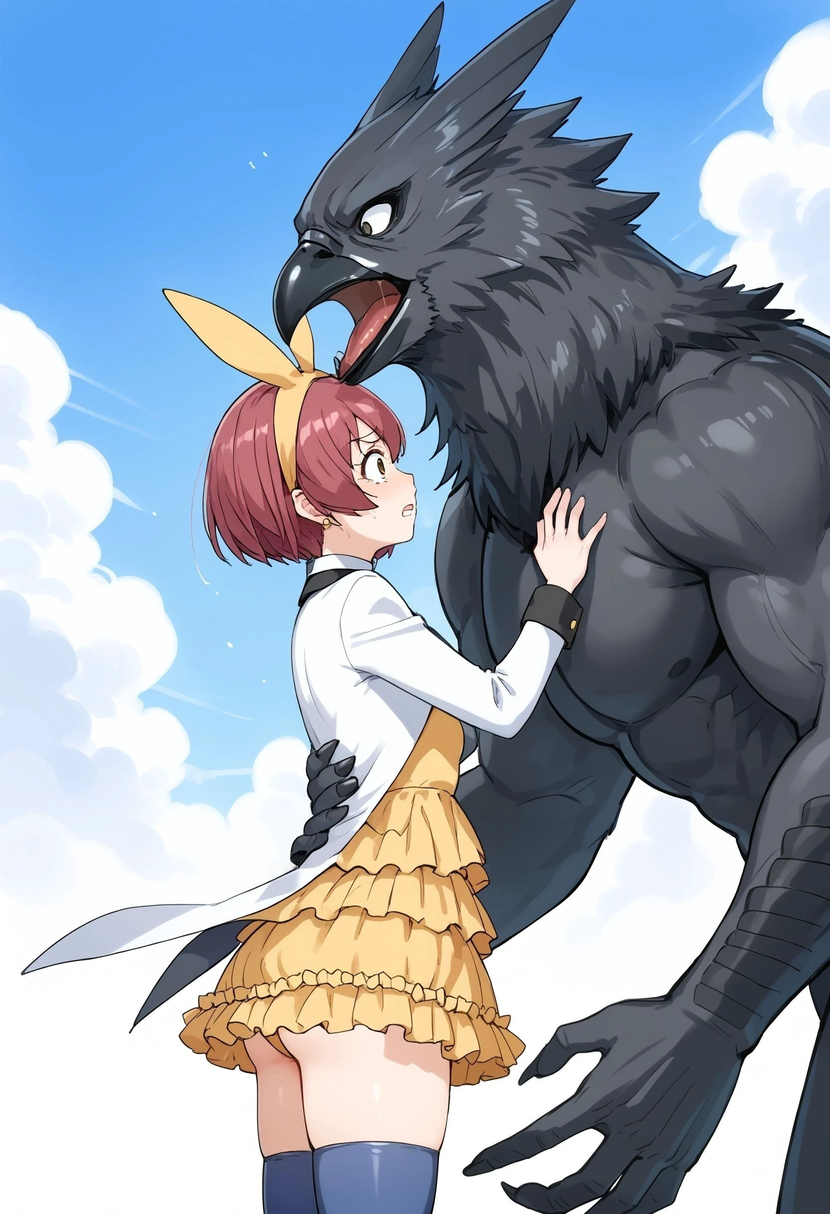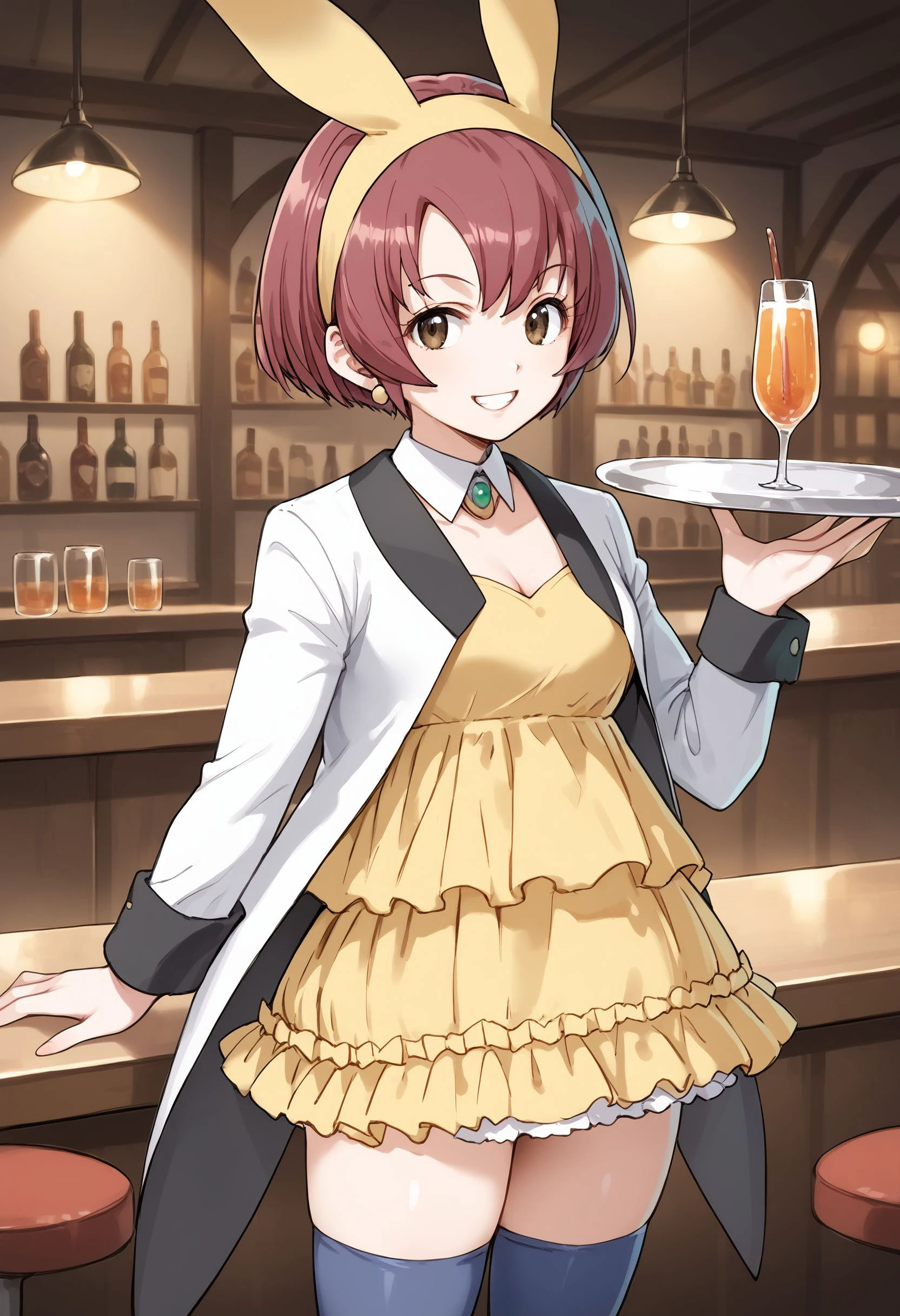 Add "brown eyes,hairband,choker,jacket,dress,thighhighs,high high heel boots,rabbit tail" for her typical look.
