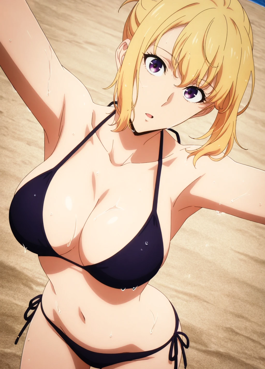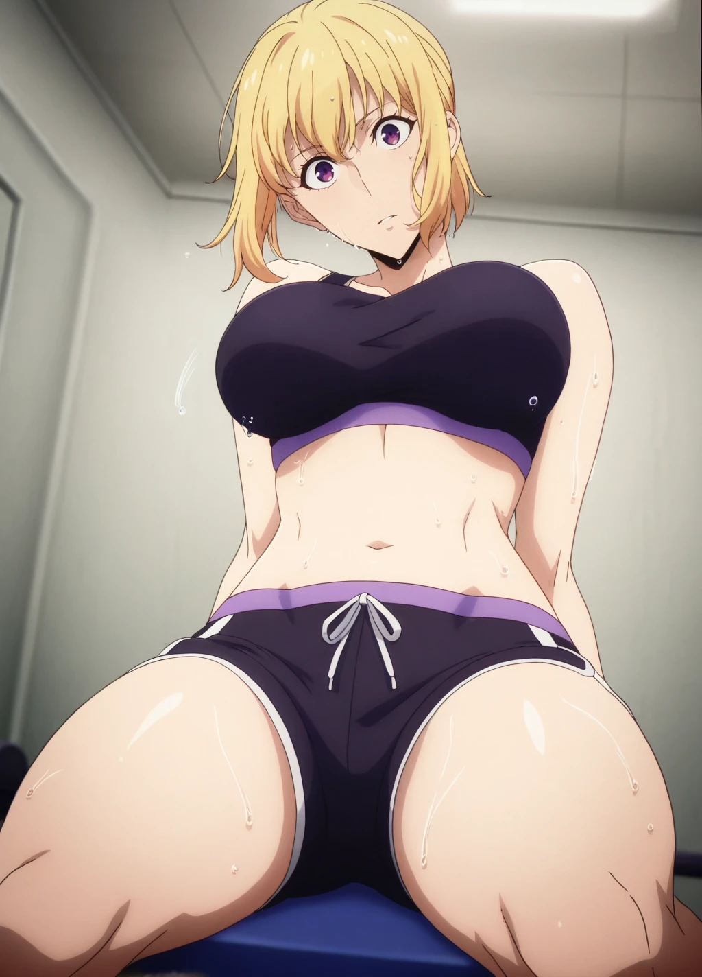 haein1, 1girl, solo, shirt, blonde hair, pants, black shirt, short hair, t-shirt, short sleeves, green pants, black footwear, purple eyes,shoes, jeans, watch, large breasts,short ponytail