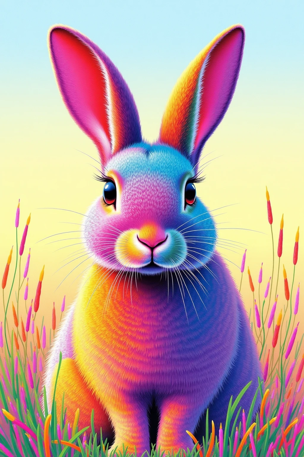 Vibrant color - blocked animal portraits, rabbit in pastel - neon blend, meadow backdrop, gentle and bright.
