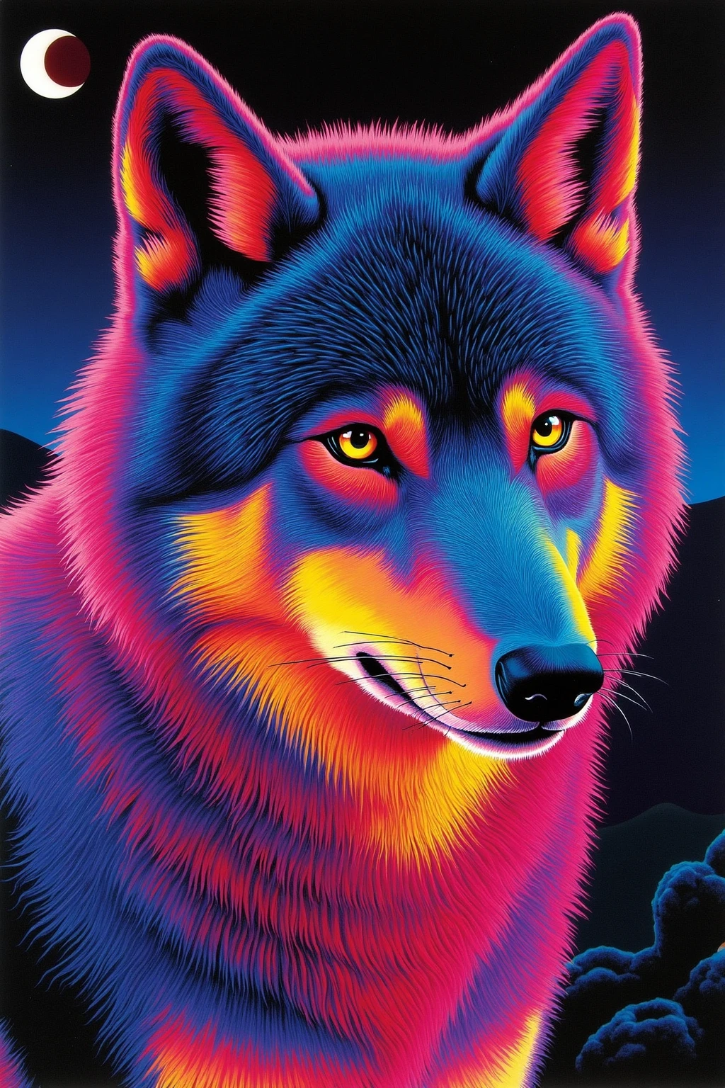 Vibrant color - blocked animal portraits, wolf in neon - dark shades, moonlit scene, wild energy, fierce and cool.
