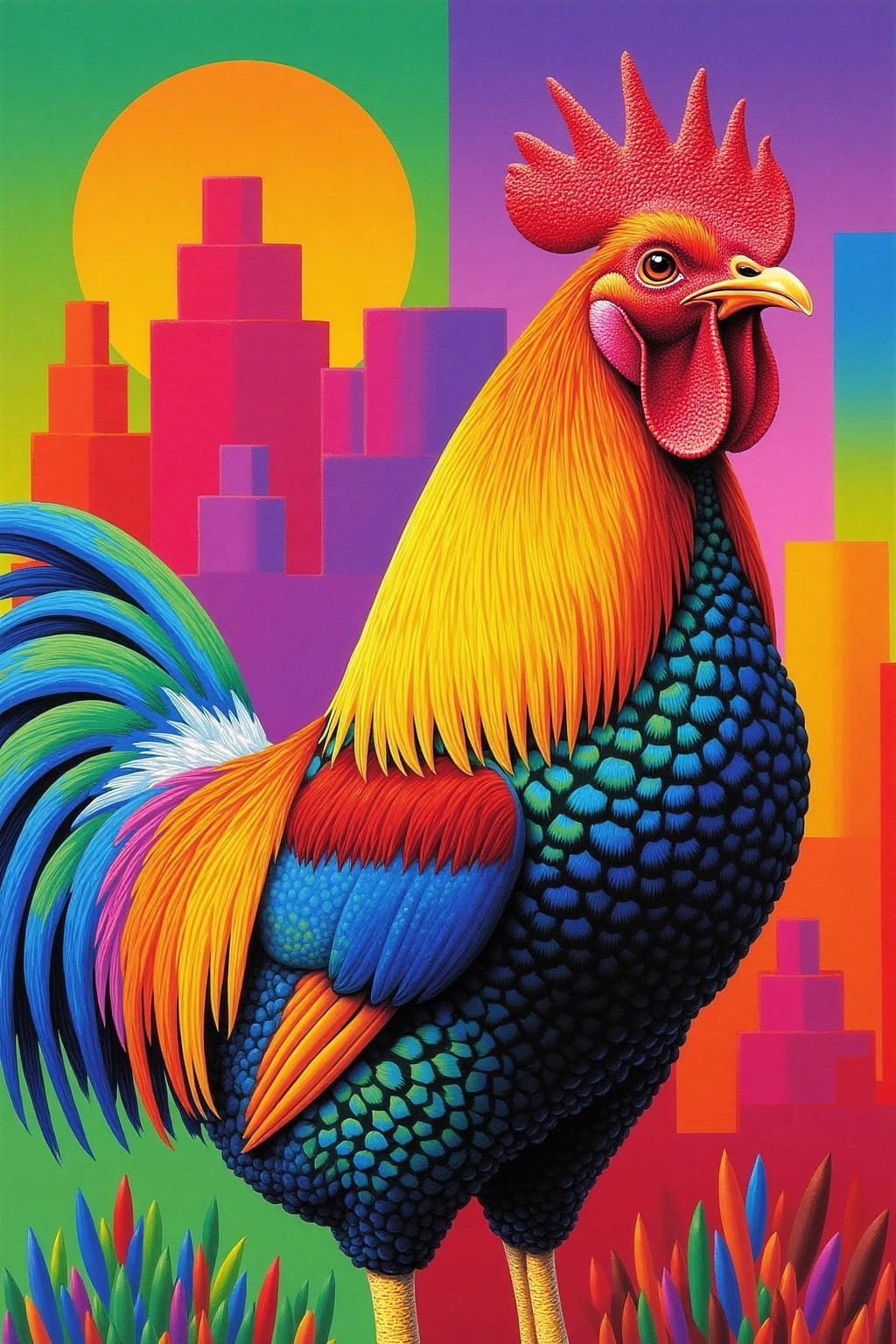 Vibrant color - blocked animal portraits, rooster with rainbow plumage, farmyard in vivid tones, lively and noisy.