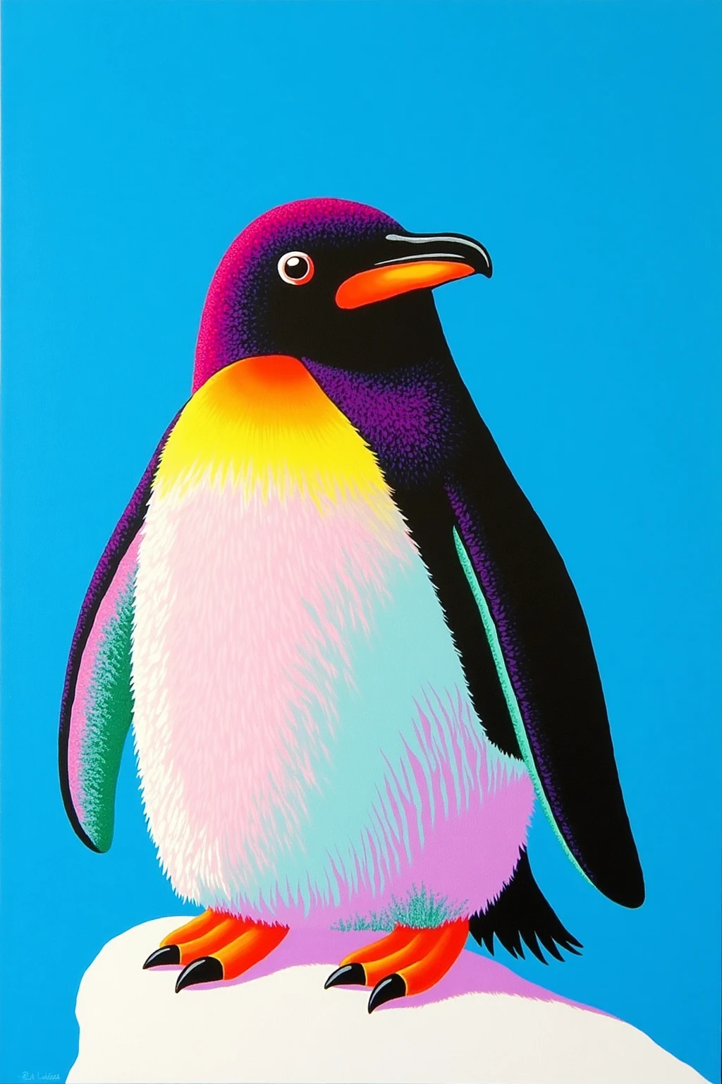 Vibrant color - blocked animal portraits, penguin with bright - colored feathers, icy blue background, cute and vibrant.