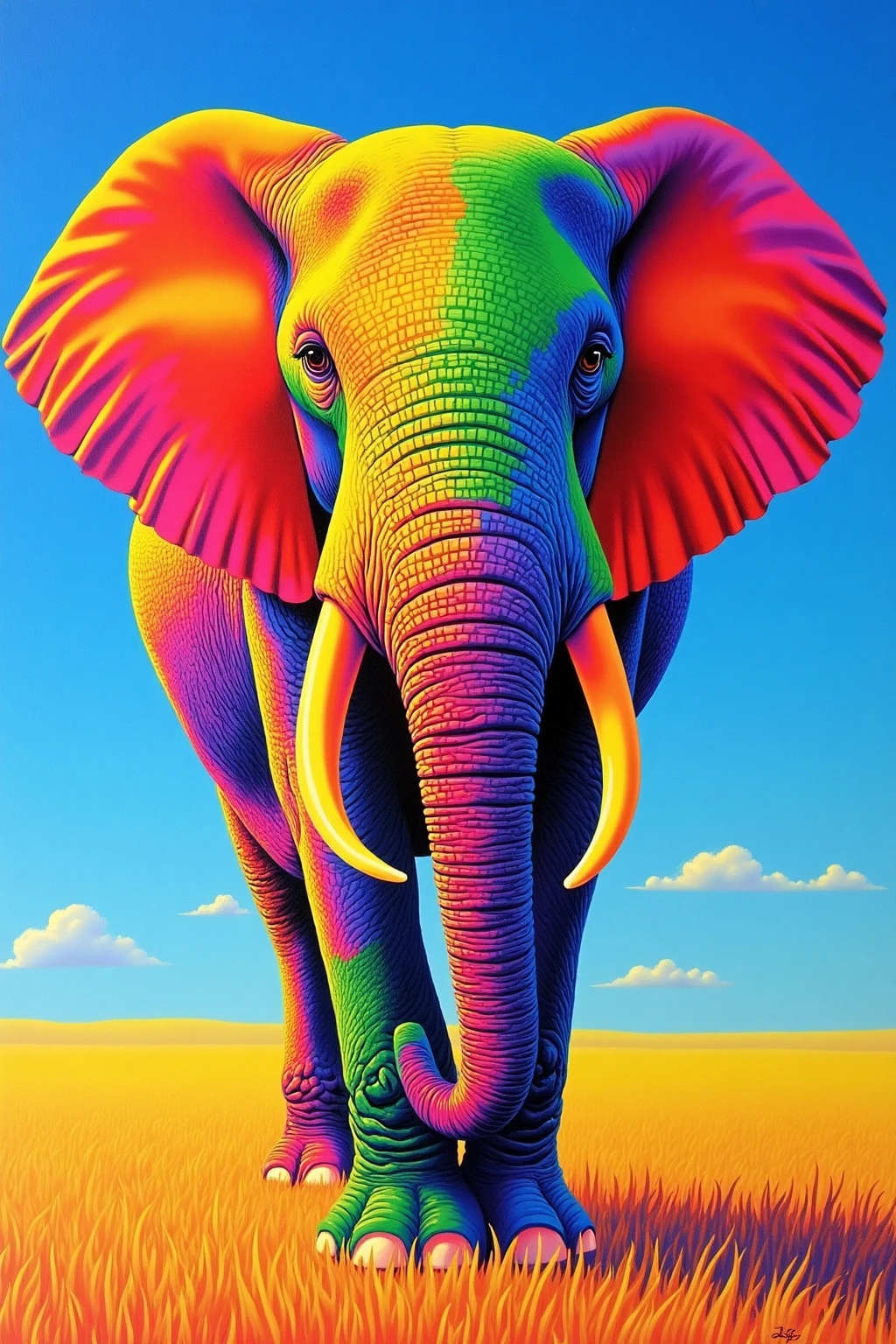 Vibrant color - blocked animal portraits, elephant with rainbow - shaded tusks, bright sky backdrop, smooth gradients, eye - catching.