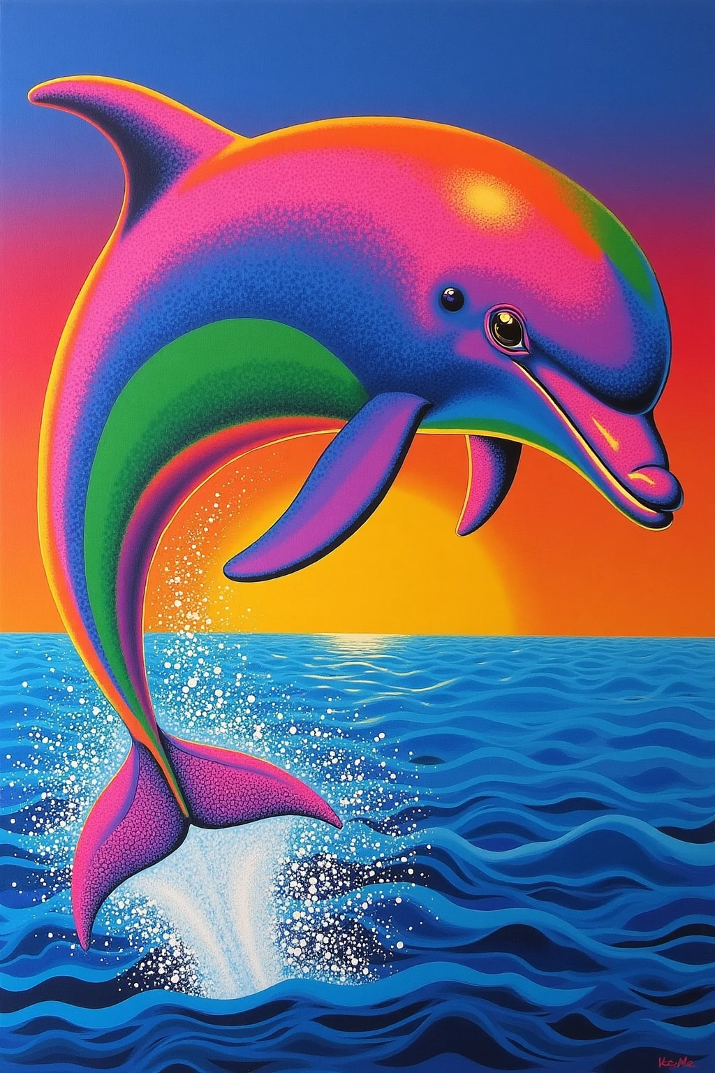 Vibrant color - blocked animal portraits, dolphin leaping, ocean in vivid tones, dynamic curves, lively and energetic.