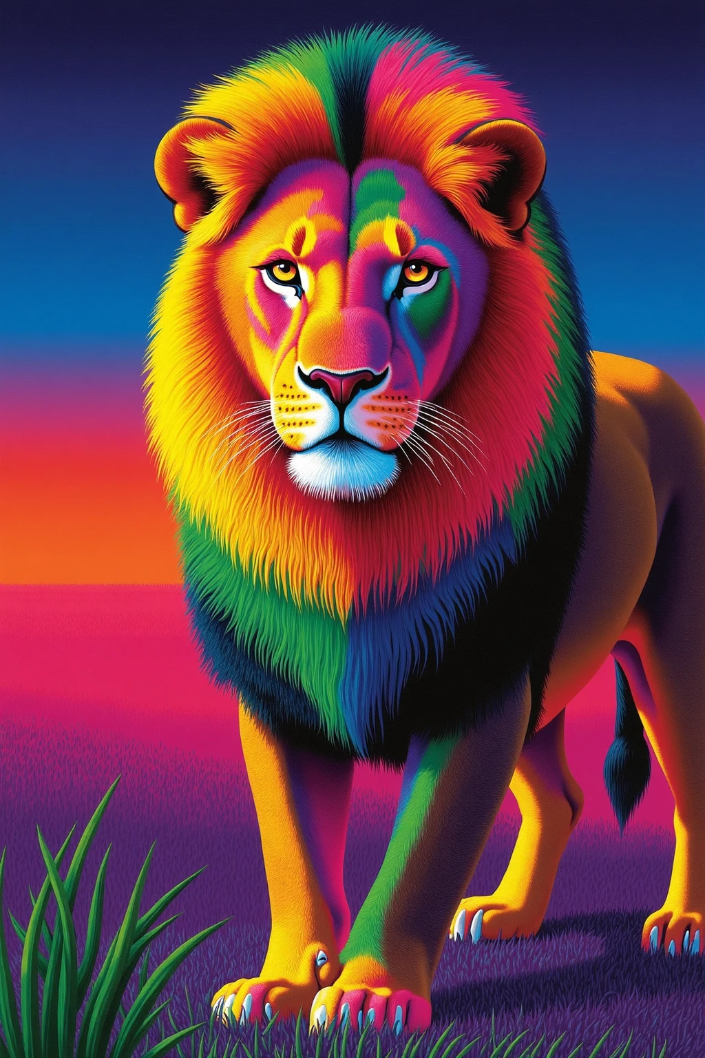Vibrant color - blocked animal portraits, lion with rainbow mane, savannah in bold colors, regal stance, powerful.