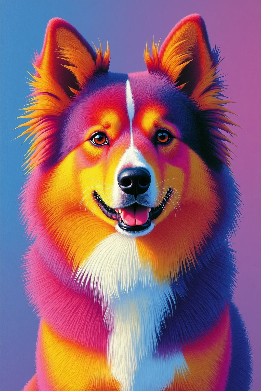 Vibrant color - blocked animal portraits, dog with multi - colored fur patches, soft lighting, friendly vibe, warm and inviting.
