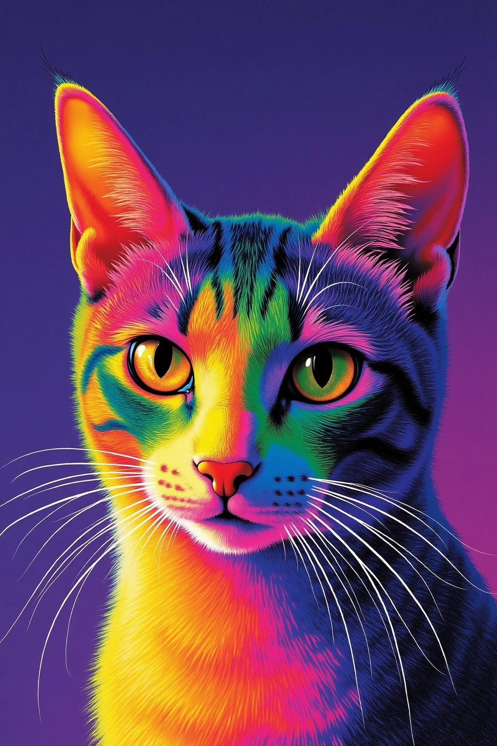 Vibrant color - blocked animal portraits, cat in neon - pastel mix, mysterious aura, sharp lines, sleek and striking.