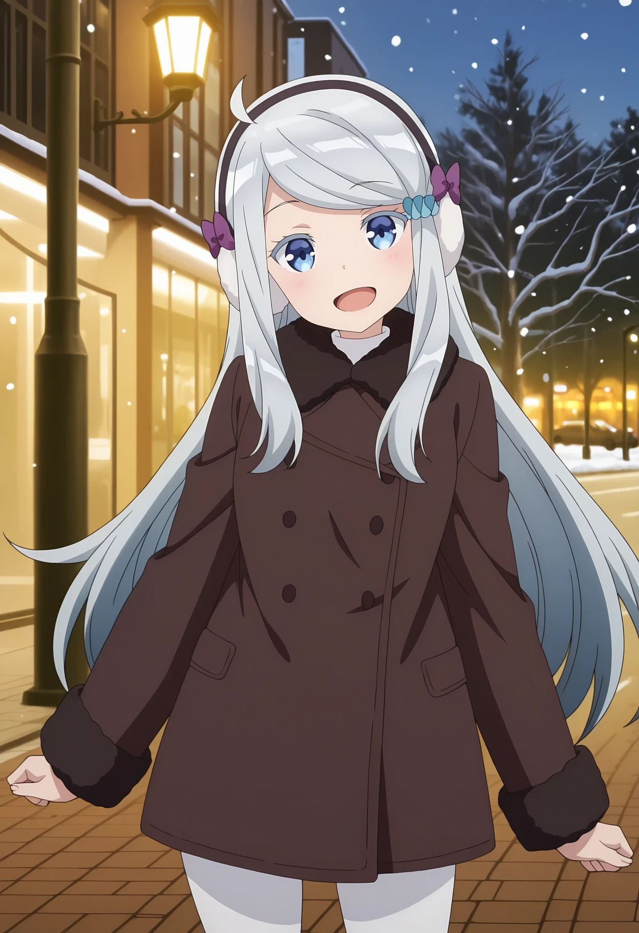earmuffs, hair bow, purple bow, fur-trimmed coat, brown coat, long sleeves, white pantyhose