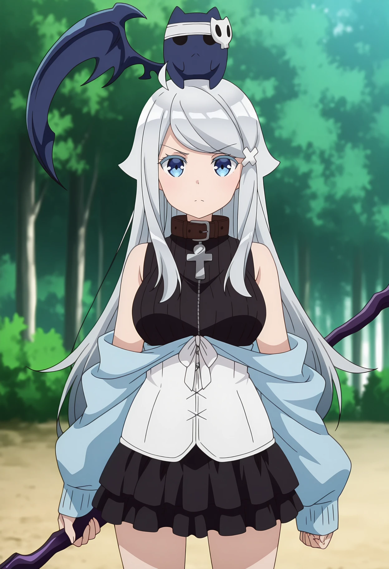 hair flaps, swept bangs, ahoge, long hair, grey hair, blue eyes, colored eyelashes, x hair ornament, animal on head, creature, belt collar, cross necklace, sleeveless shirt, ribbed shirt, black shirt, off shoulder, blue jacket, sleeves past wrists, white corset, frilled skirt, black skirt, holding weapon, scythe