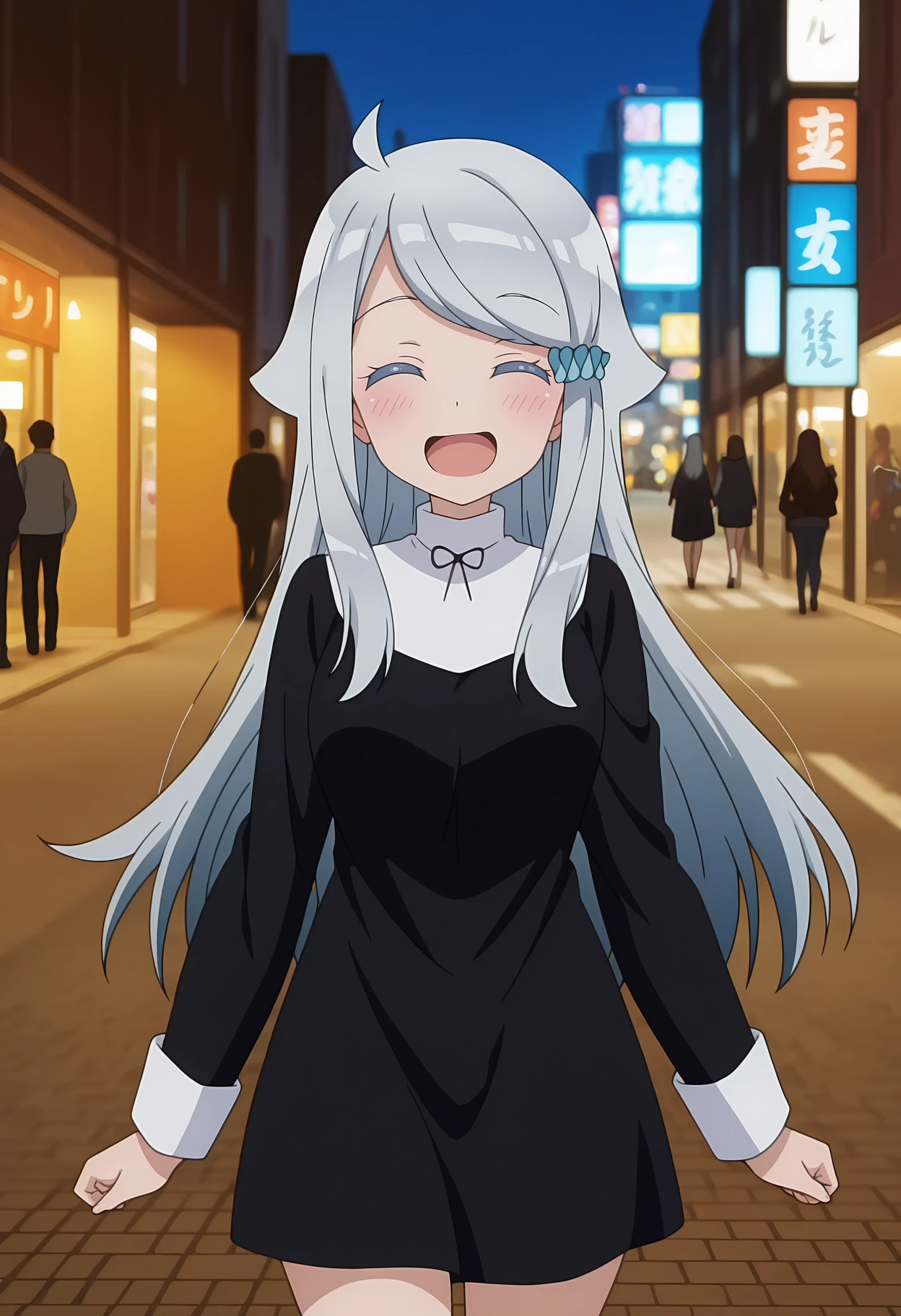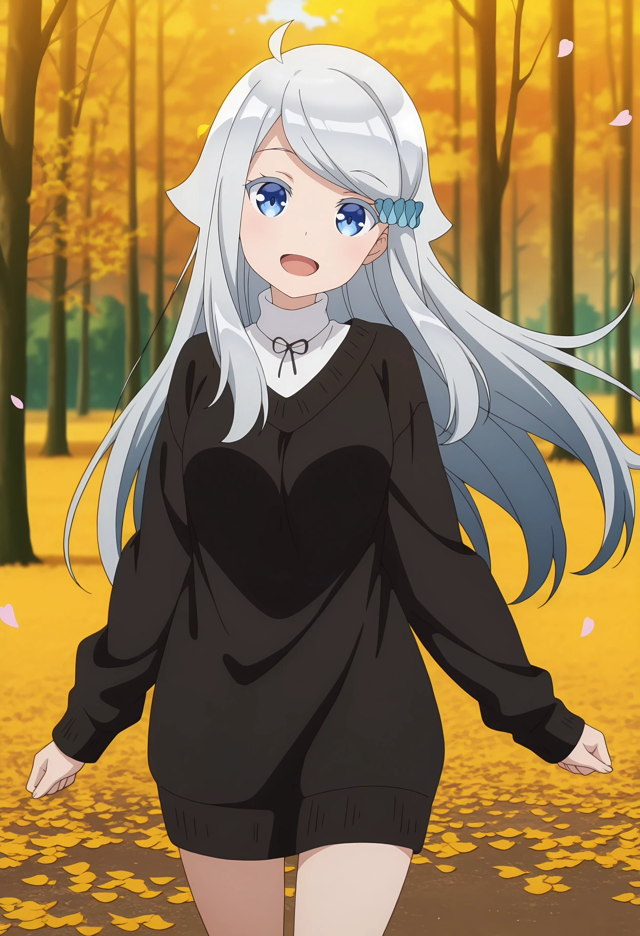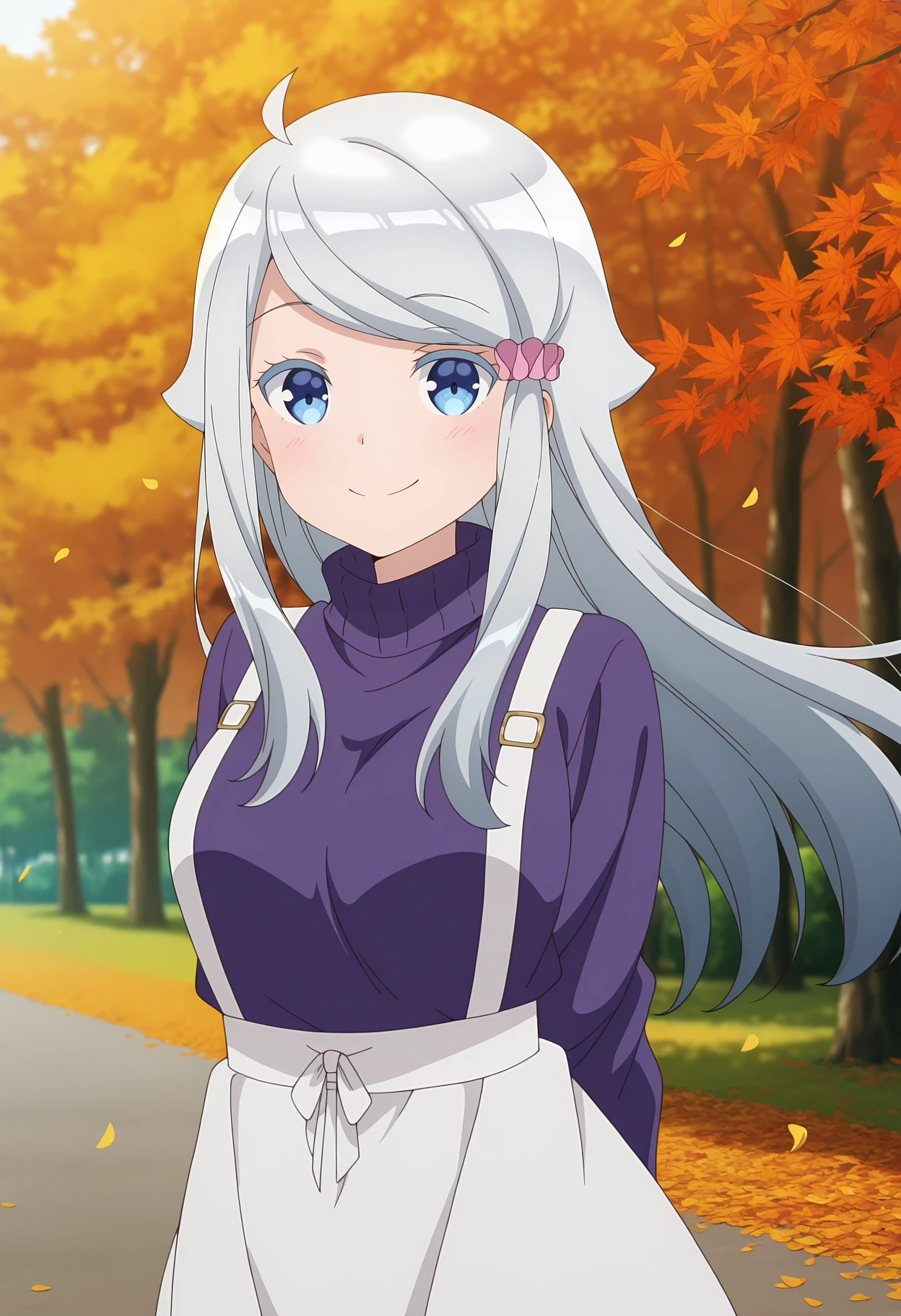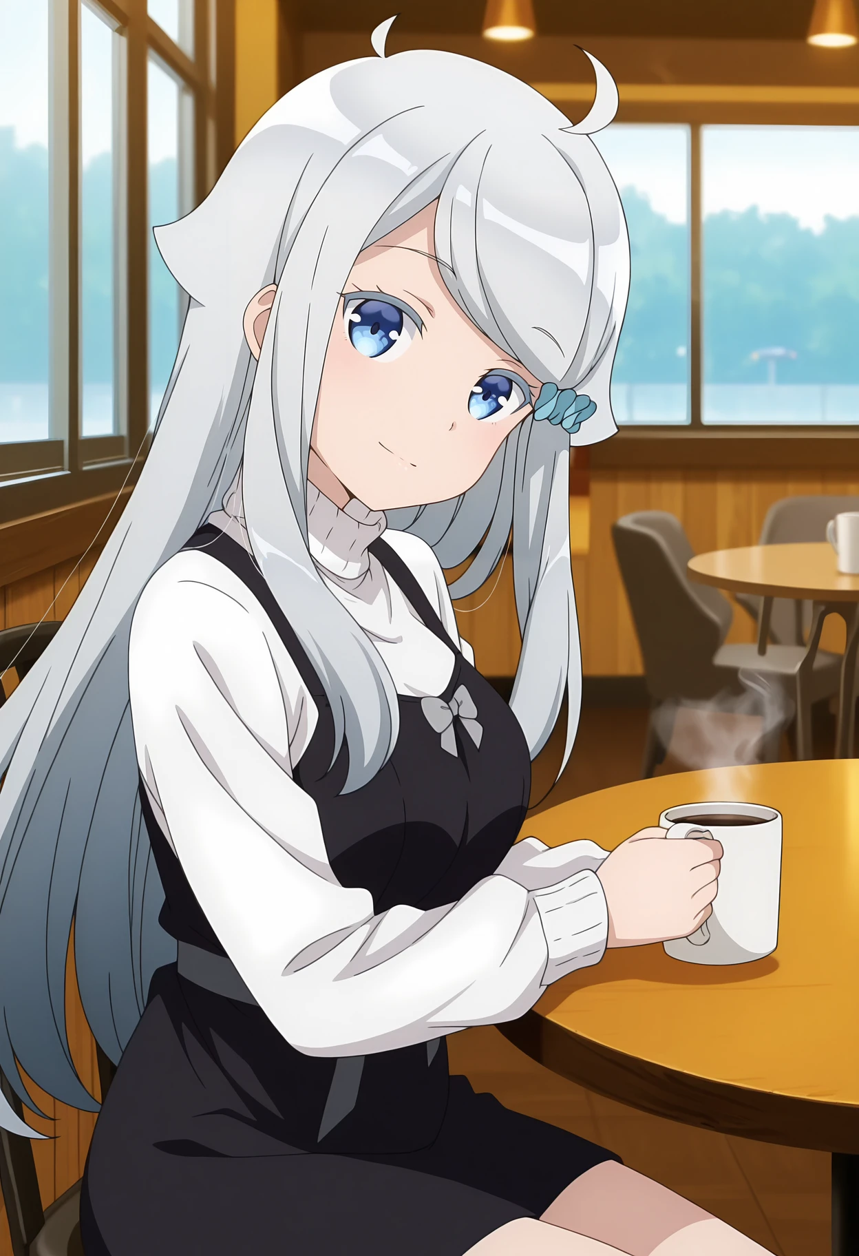 hair flaps, swept bangs, ahoge, long hair, grey hair, blue eyes, colored eyelashes, hair scrunchie, blue scrunchie