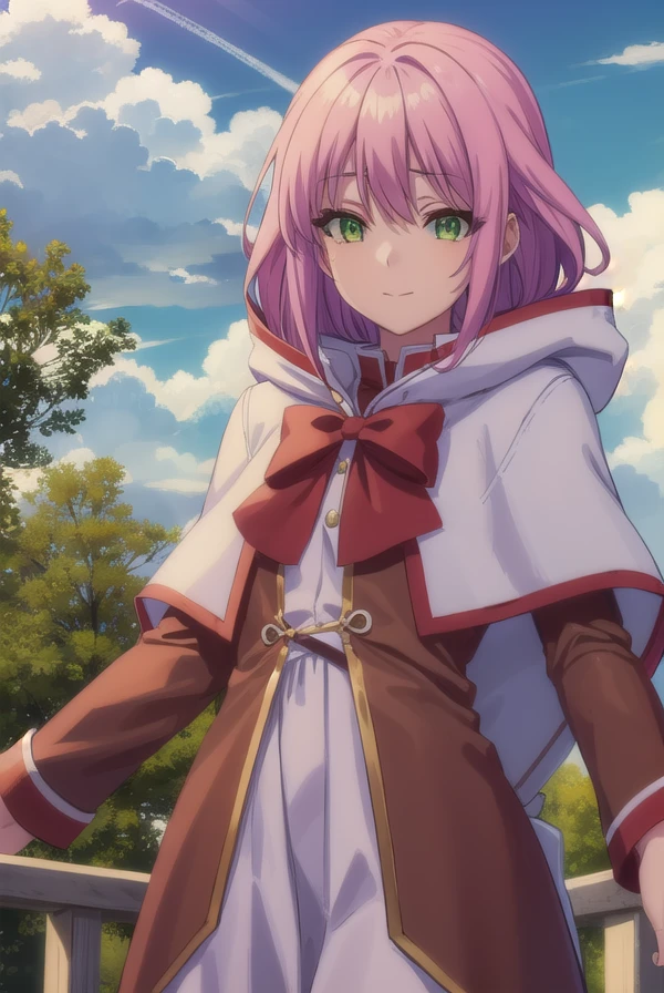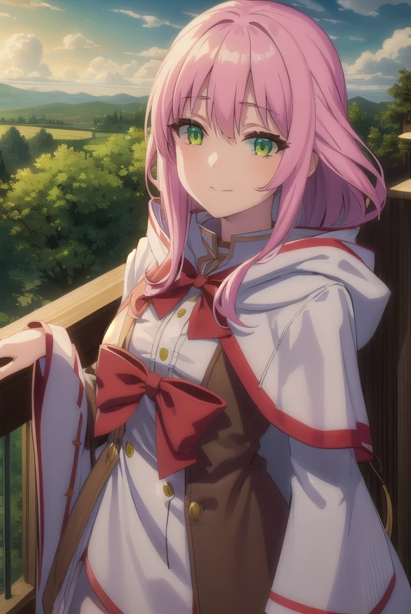 long sleeves, dress, bow, red bow, hood, robe, white robe,