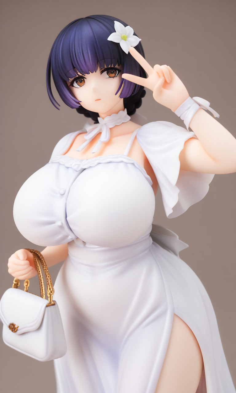 black violet hair, short hair, blunt bnags, side bangs, braid back hair with white ribbon, brown eyes, short eyes, over right hair white flower, bandaged neck, bandaged hand, bandaged arm