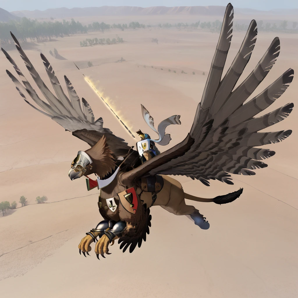 RoyalHippogryphKnight, solo, flying, animal, hippogriff, feathered wings, talons, hooves, beak, eagle, horseback riding, saddle, knight, helmet, holding shield, holding polearm, full armor,