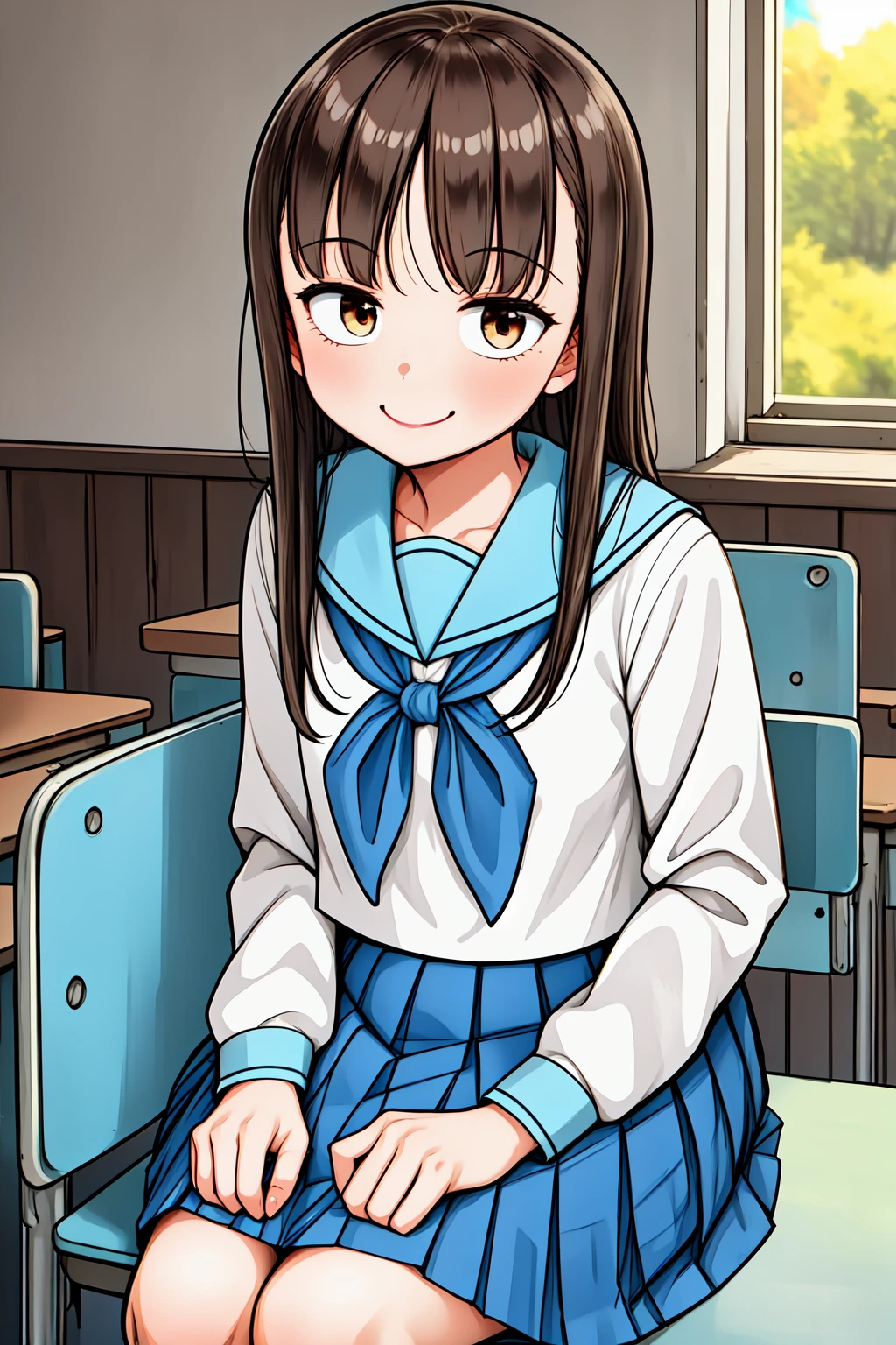 costume: school uniform, serafuku, white shirt, blue skirt, pleated skirt,
