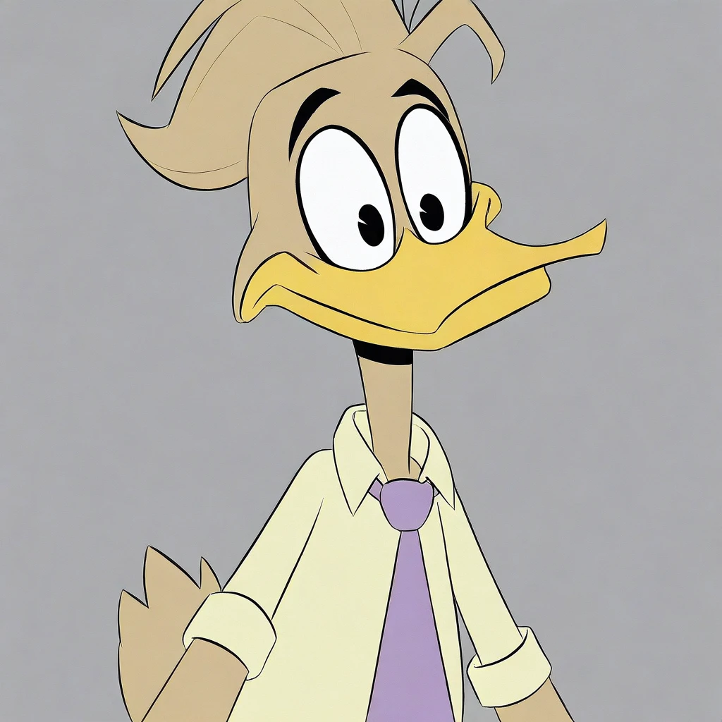 Fenton Crackshell-Cabrera, duck, light brown feathers, light brown hair, black eyes, Yellow beak, Duck feet, cream shirt, purple tie