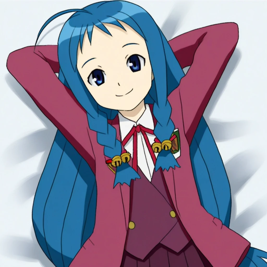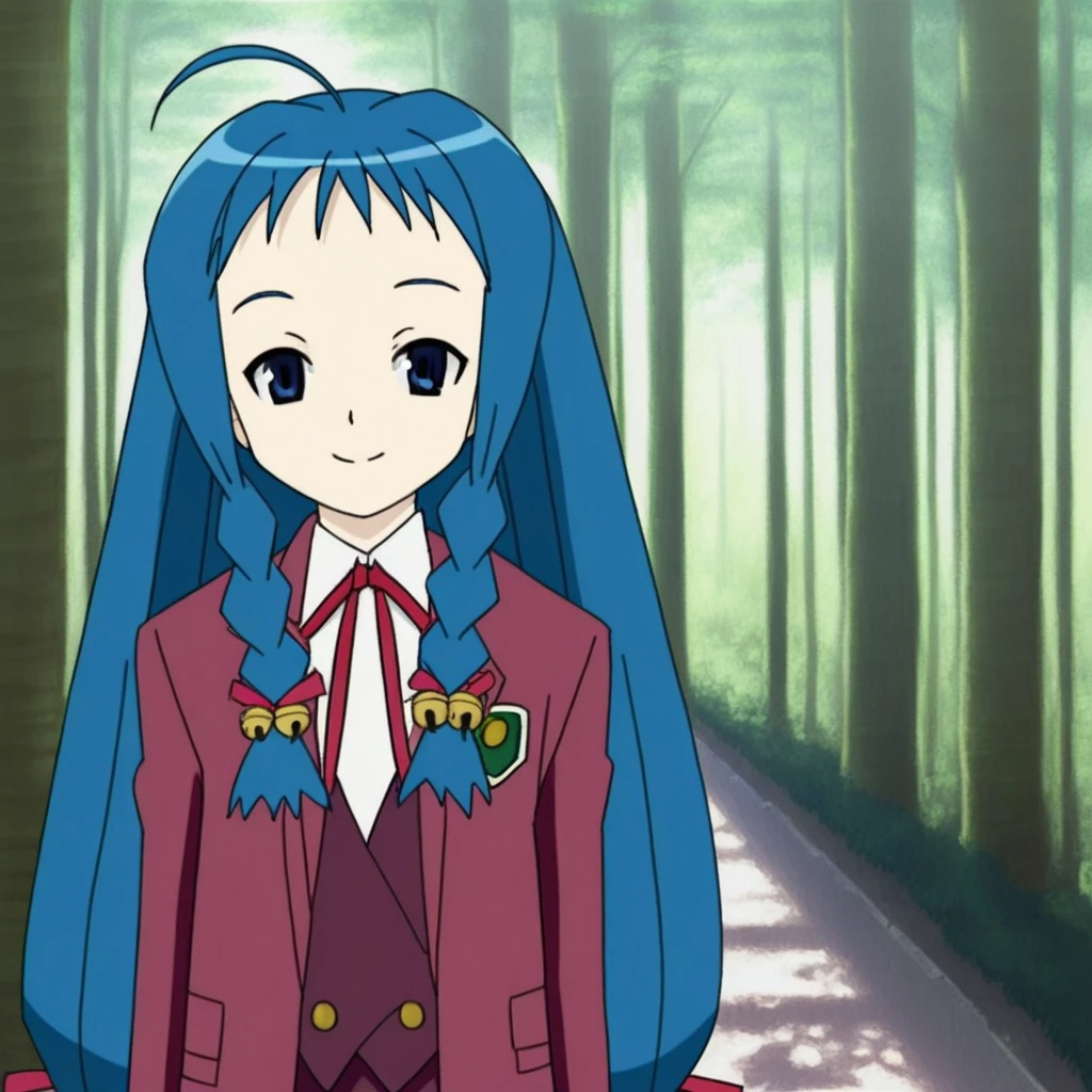 ayase_y, 1girl, long hair, blue hair, ahoge, twin braids, hair bell, blue eyes, school uniform, jacket, skirt