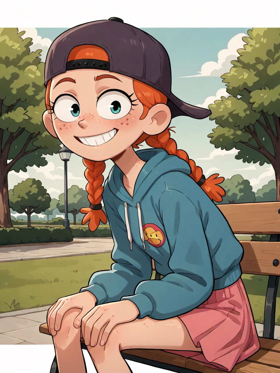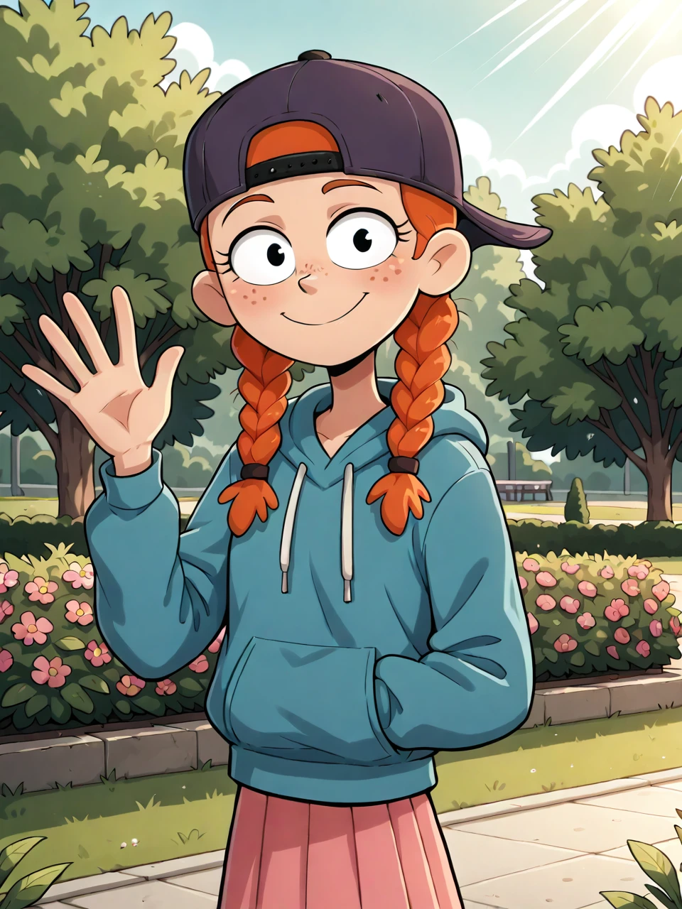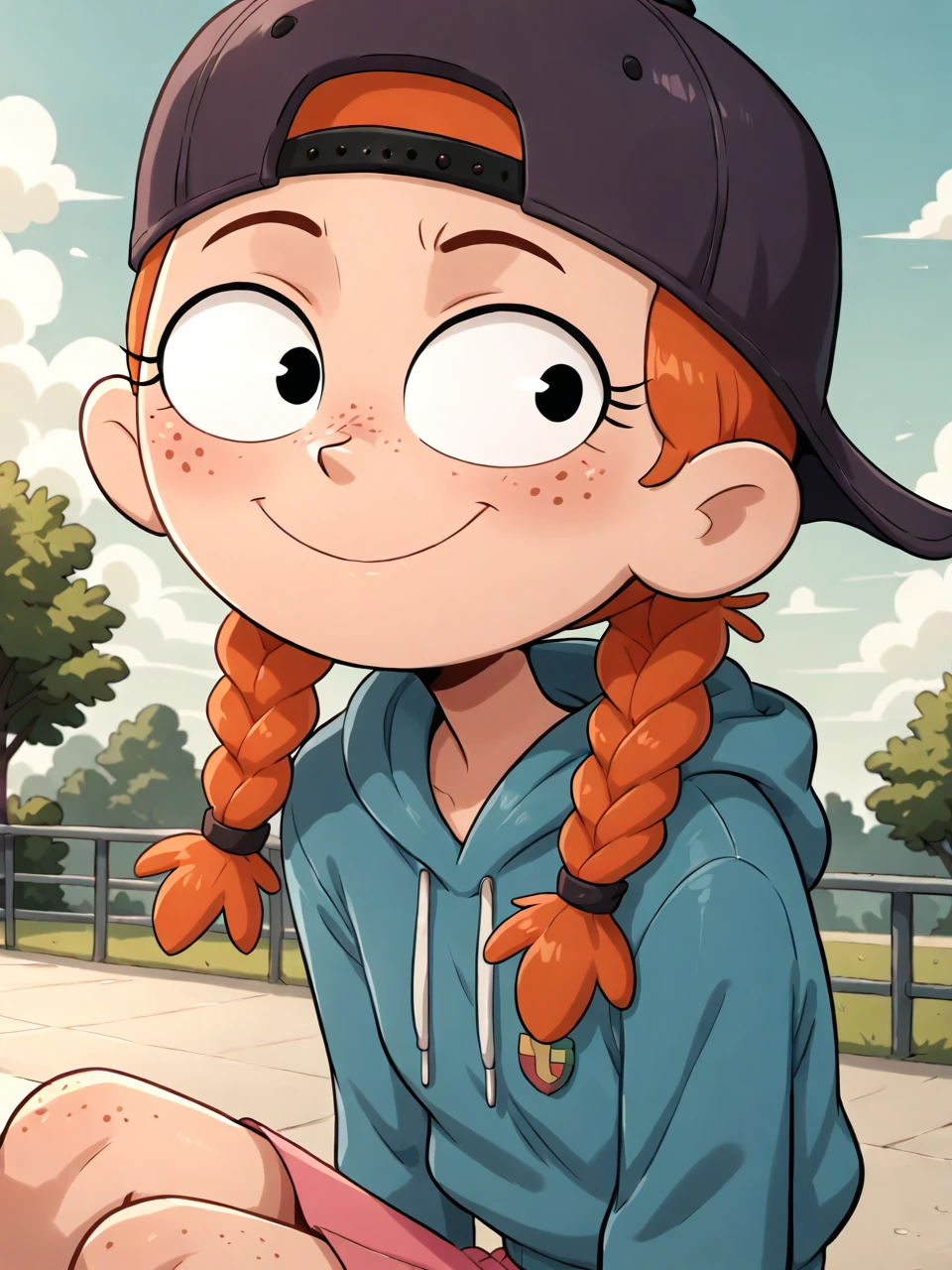 AmphiMaggie, 1girl, solo, orange hair, braid, twin braids, freckles, skinny, smile, baseball cap, backwards hat, pink skirt, blue hoodie,