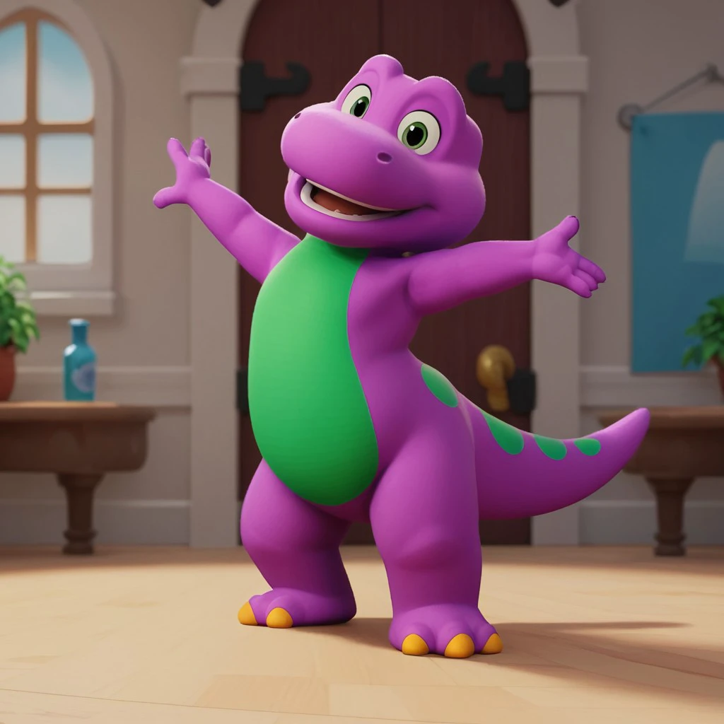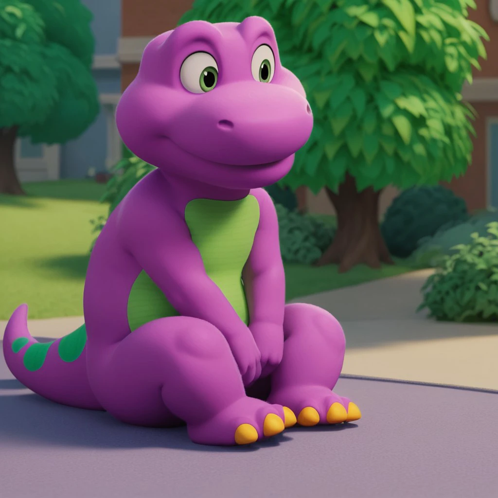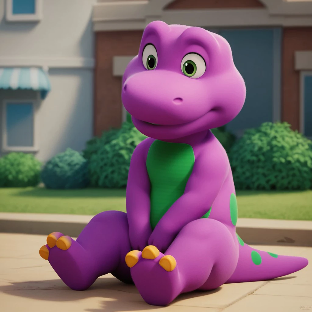 Barneybw, semi-anthro, male, dinosaur, purple skin, green eyes,