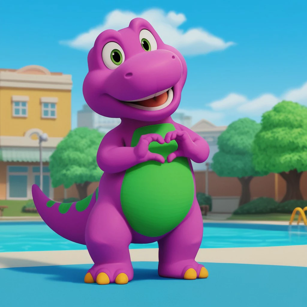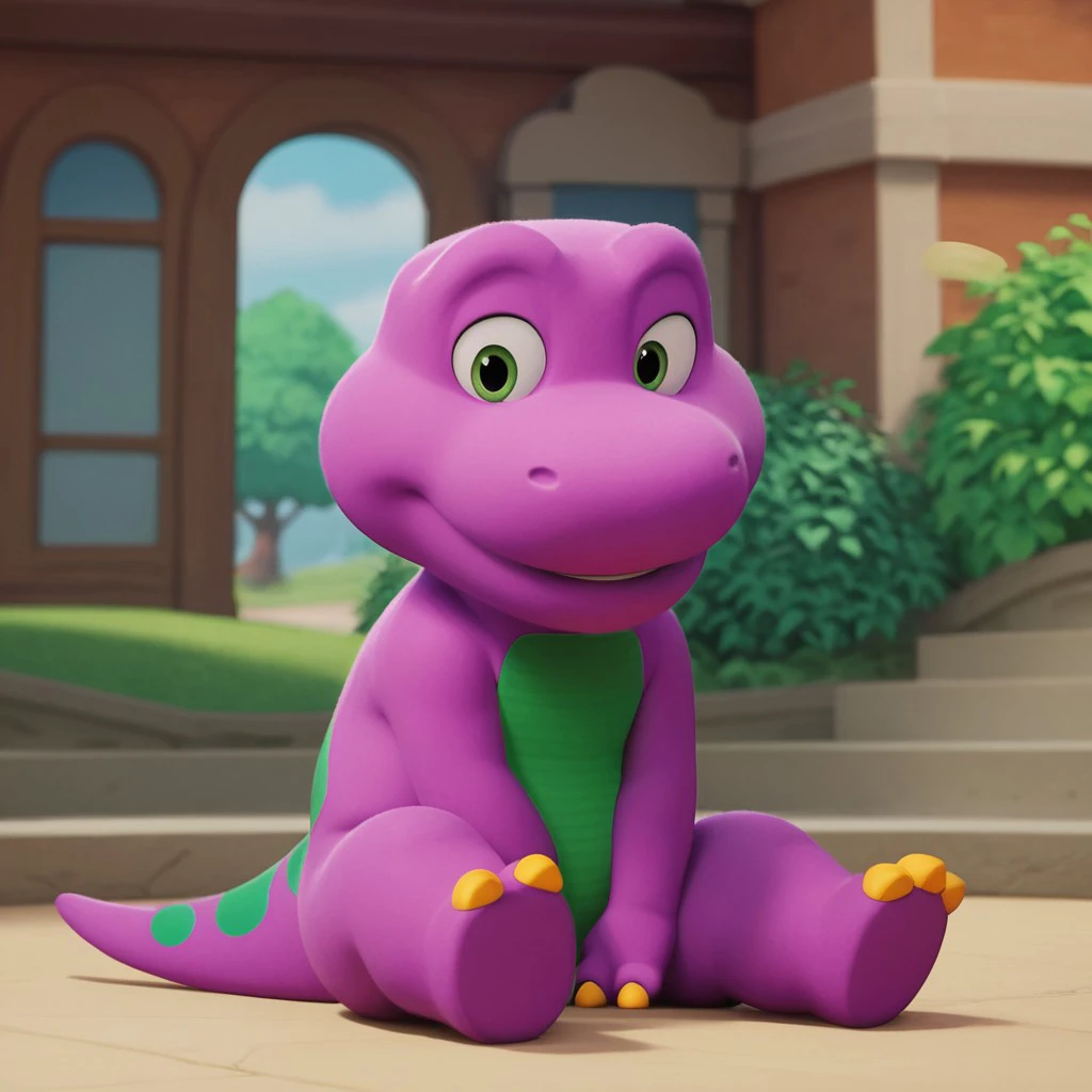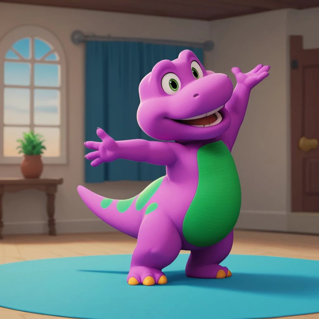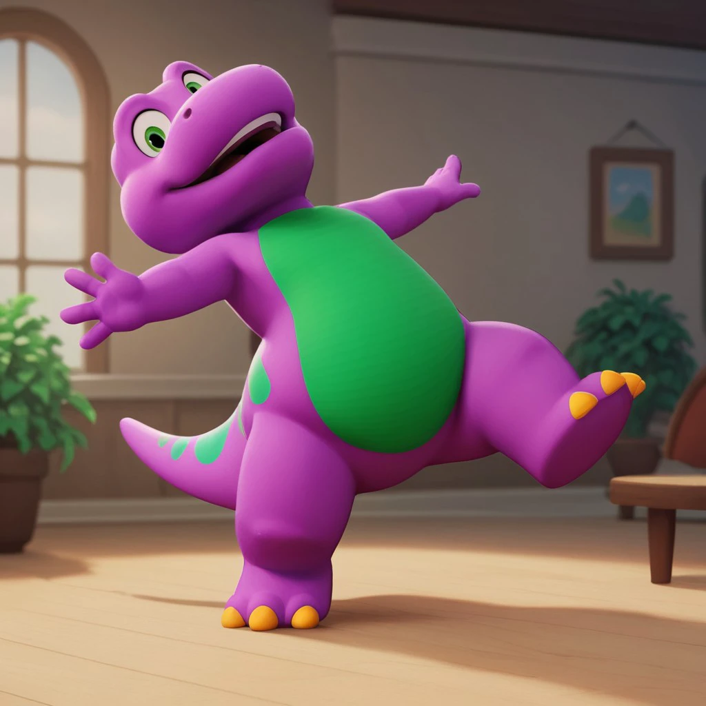 Barneybw, semi-anthro, male, dinosaur, purple skin, green eyes,