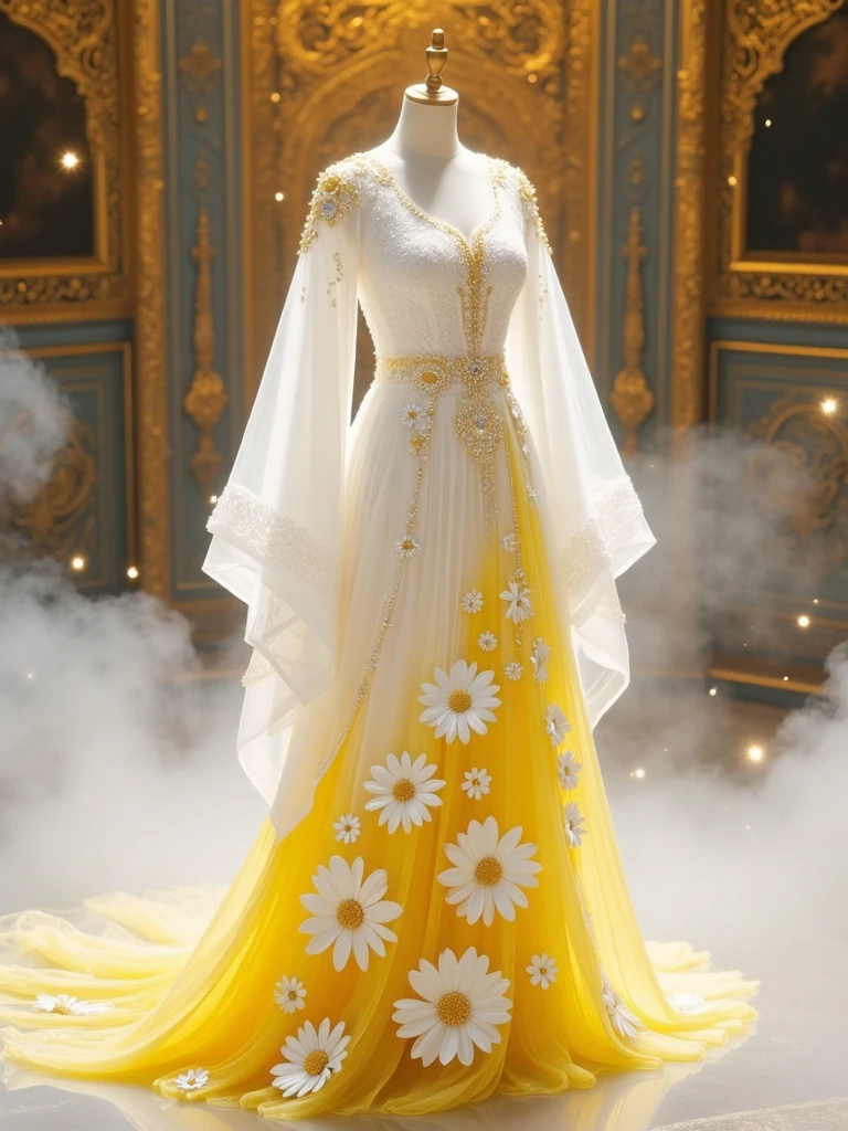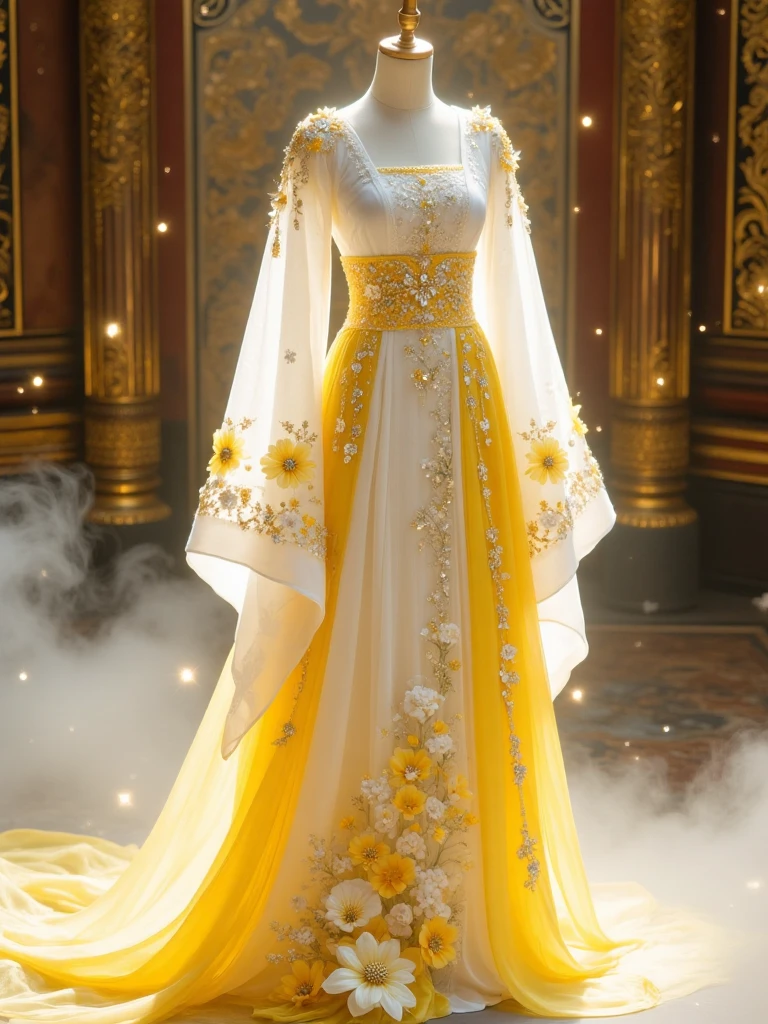 3. Fantasy-style ancient Chinese dresses, yellow hue, embroidered with blooming chrysanthemums, a golden sash cinching the waist, in a palace-like misty scene.