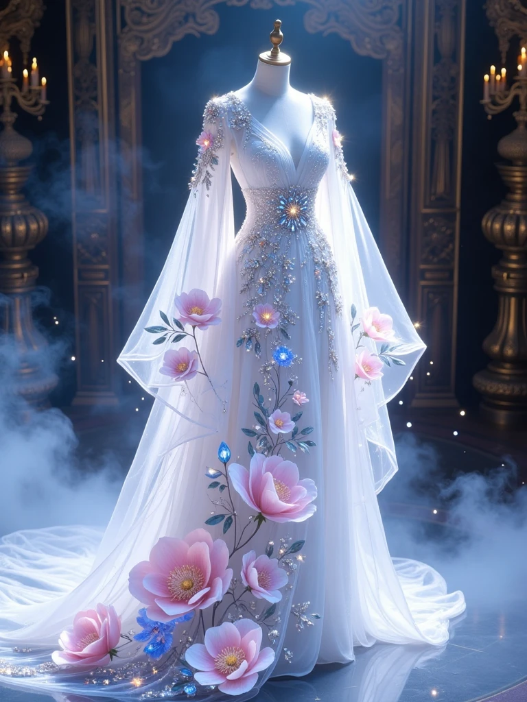 2. Fantasy-style ancient Chinese dresses, in pastel pink, with flowing sleeves, dotted with crystal-like embellishments, under a soft, dreamy light.