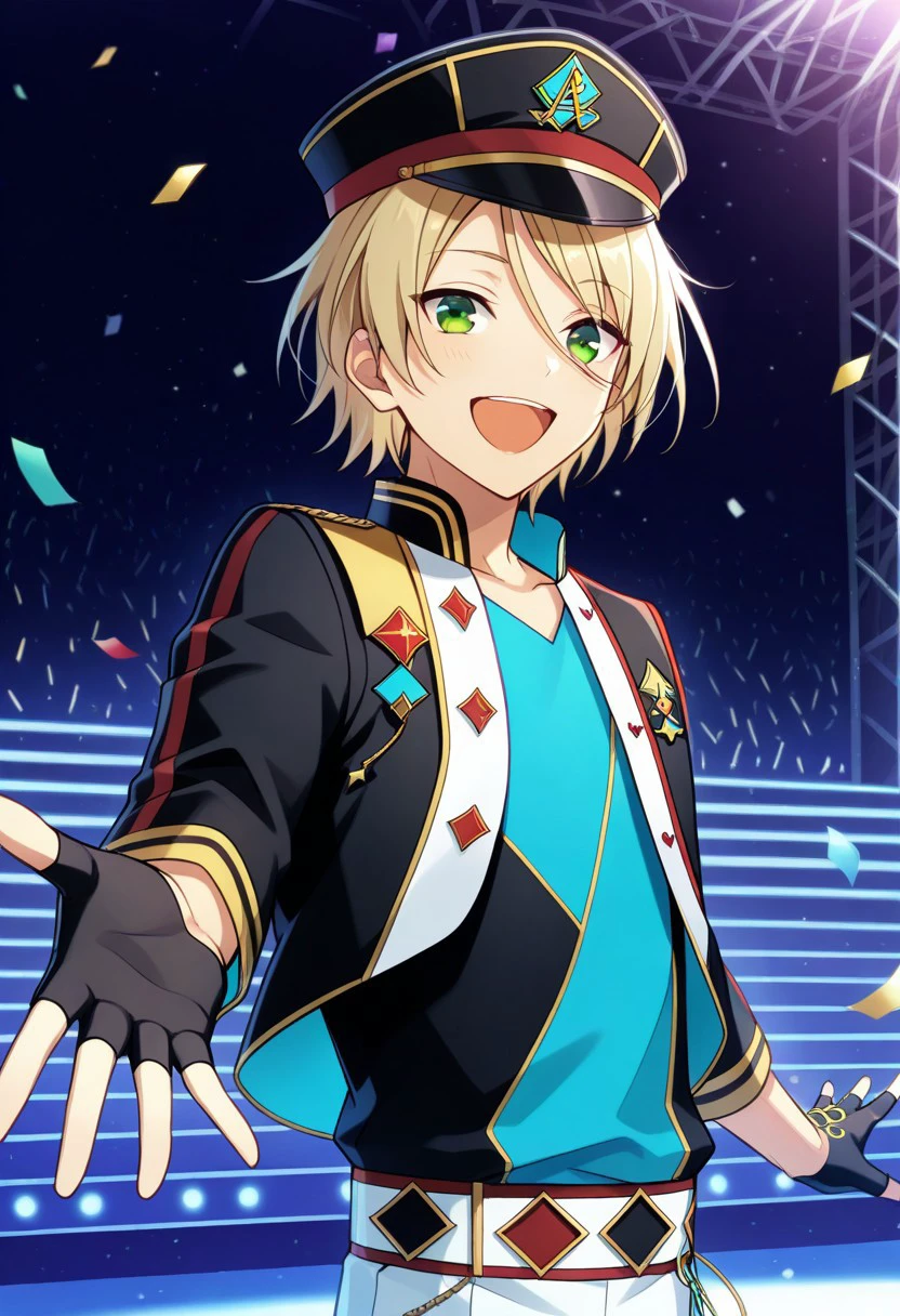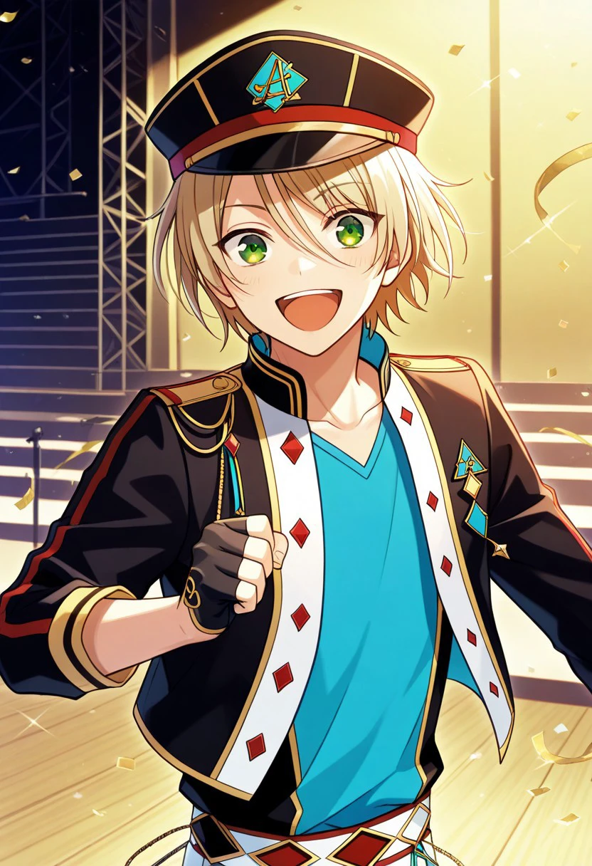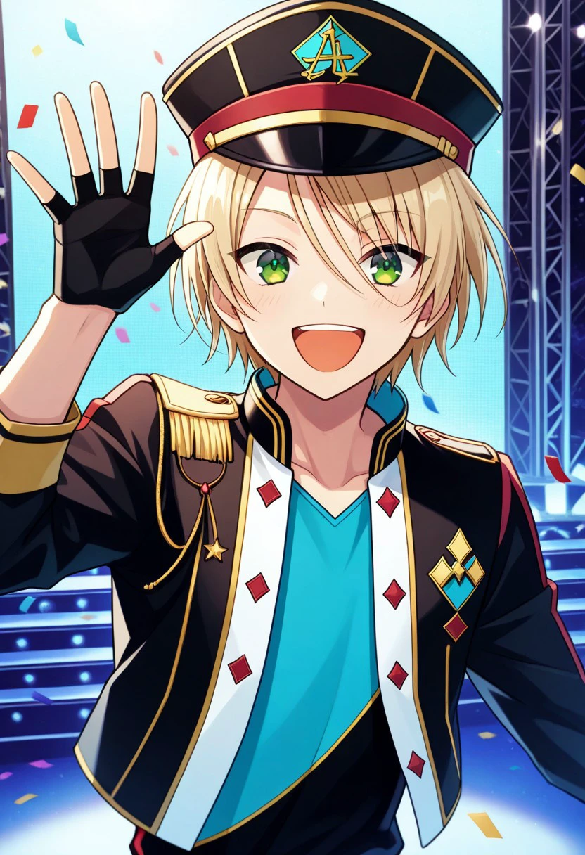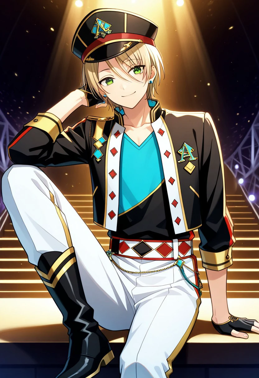 shiratori, 1boy, male focus, solo, blonde hair, hair between eyes, short hair, green eyes, jewelry, earrings, alkaloid uniform, hat, peaked cap, shirt, blue shirt, black shirt, multicolored shirt, jacket, black jacket, cropped jacket, open jacket, open clothes, gloves, black gloves, fingerless gloves, belt, pants, white pants, boots, black footwear,
