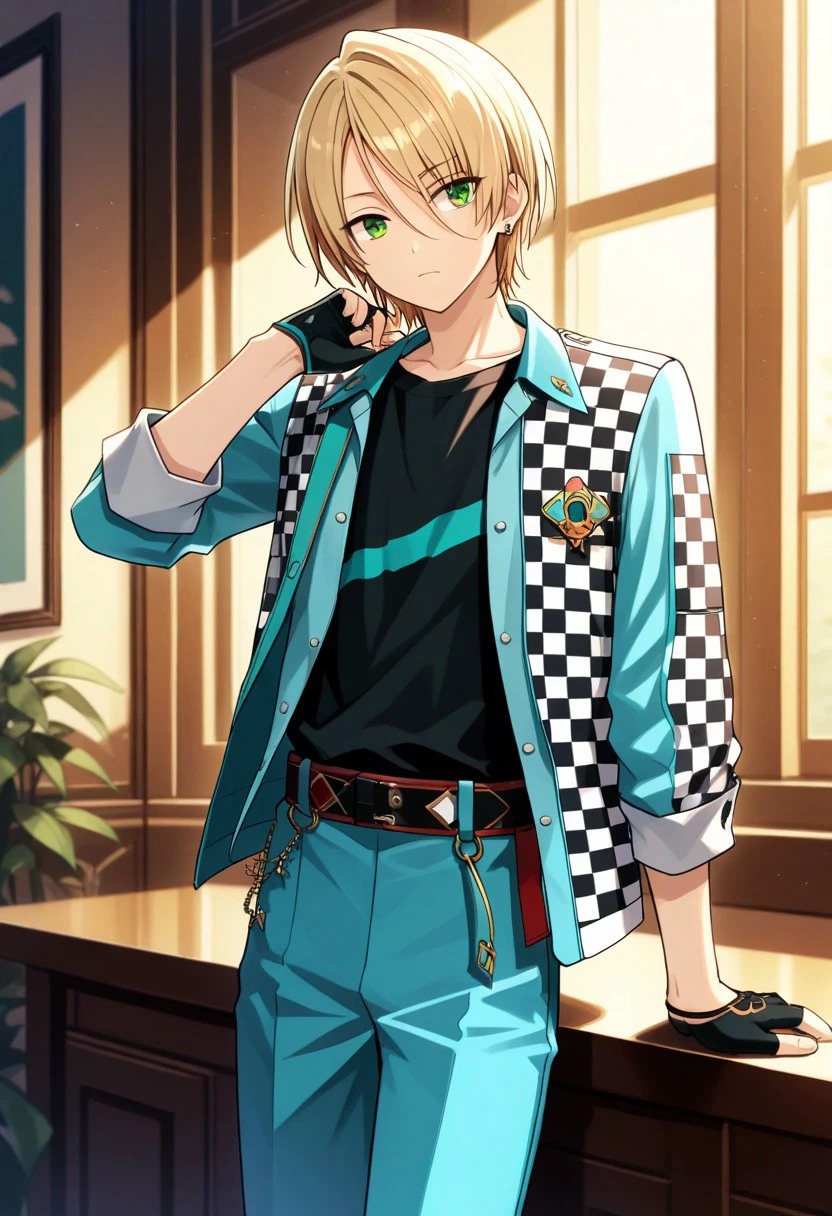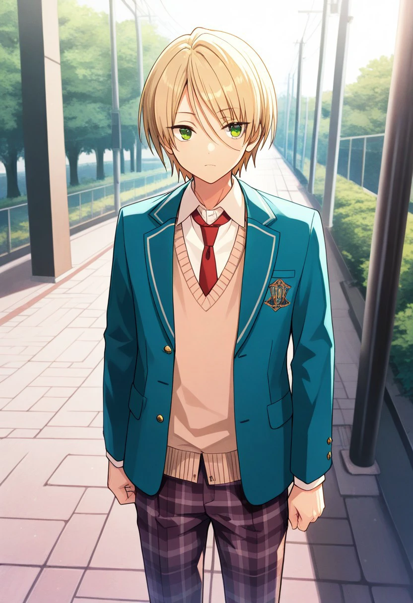 shiratori, 1boy, male focus, solo, blonde hair, hair between eyes, short hair, green eyes, school uniform, shirt, collared shirt, white shirt, necktie, red necktie, jacket, blue jacket, blazer, long sleeves, cardigan, brown cardigan, pants, plaid, plaid pants,