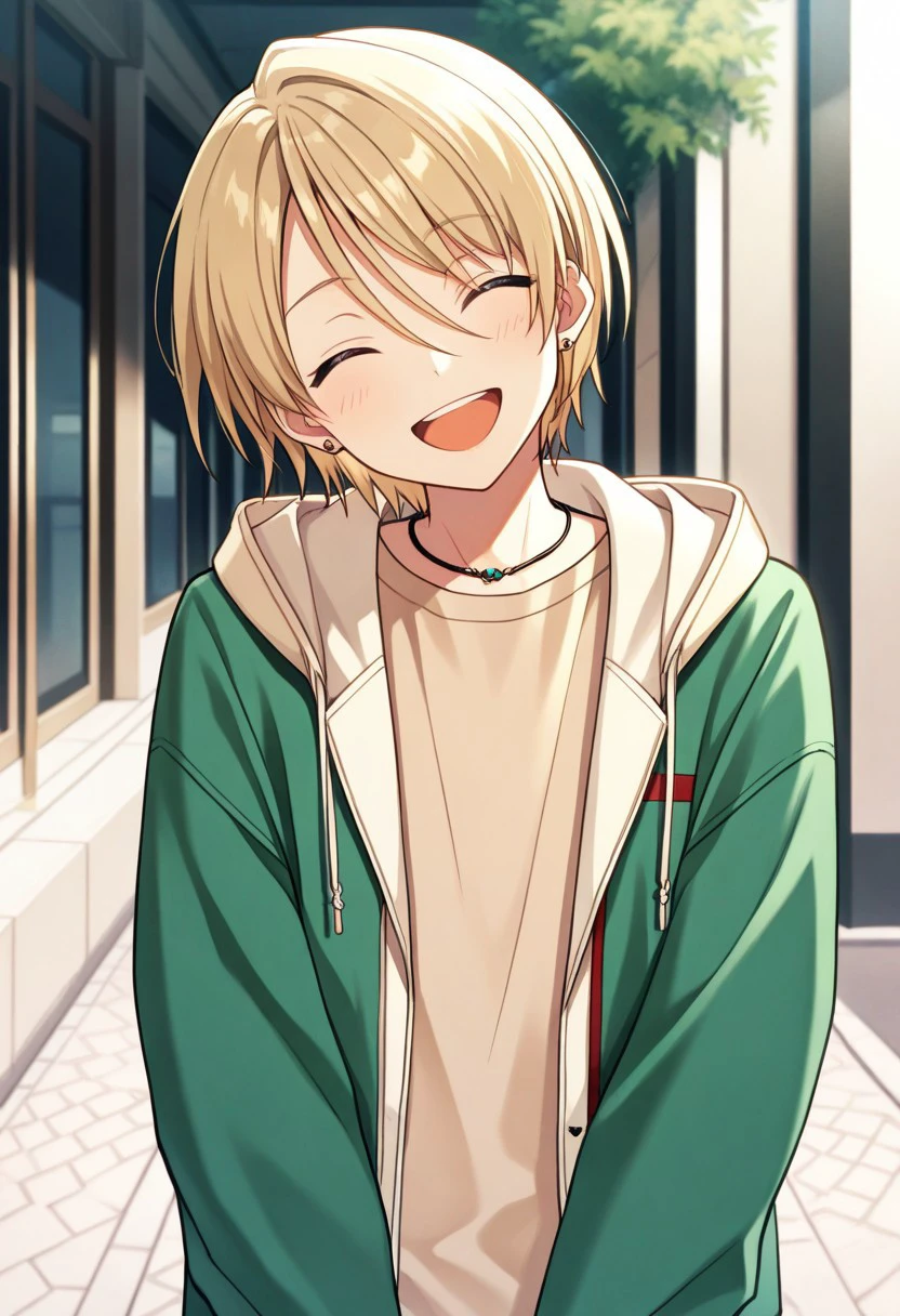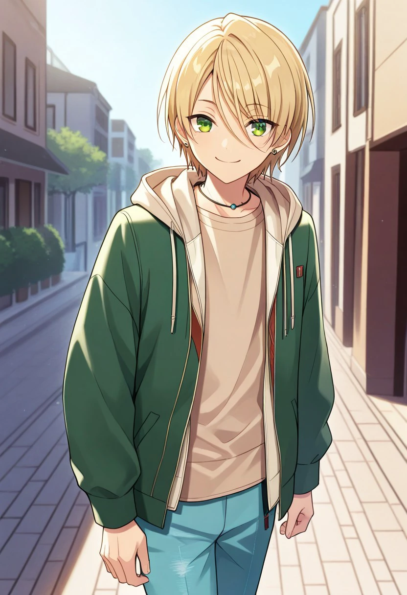 shiratori, 1boy, male focus, solo, blonde hair, hair between eyes, short hair, green eyes, jewelry, earrings, necklace, shirt, brown shirt, jacket, green jacket, open jacket, open clothes, hood, drawstring, long sleeves, pants, blue pants,