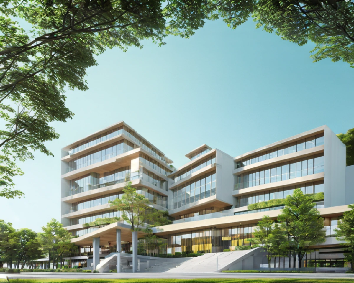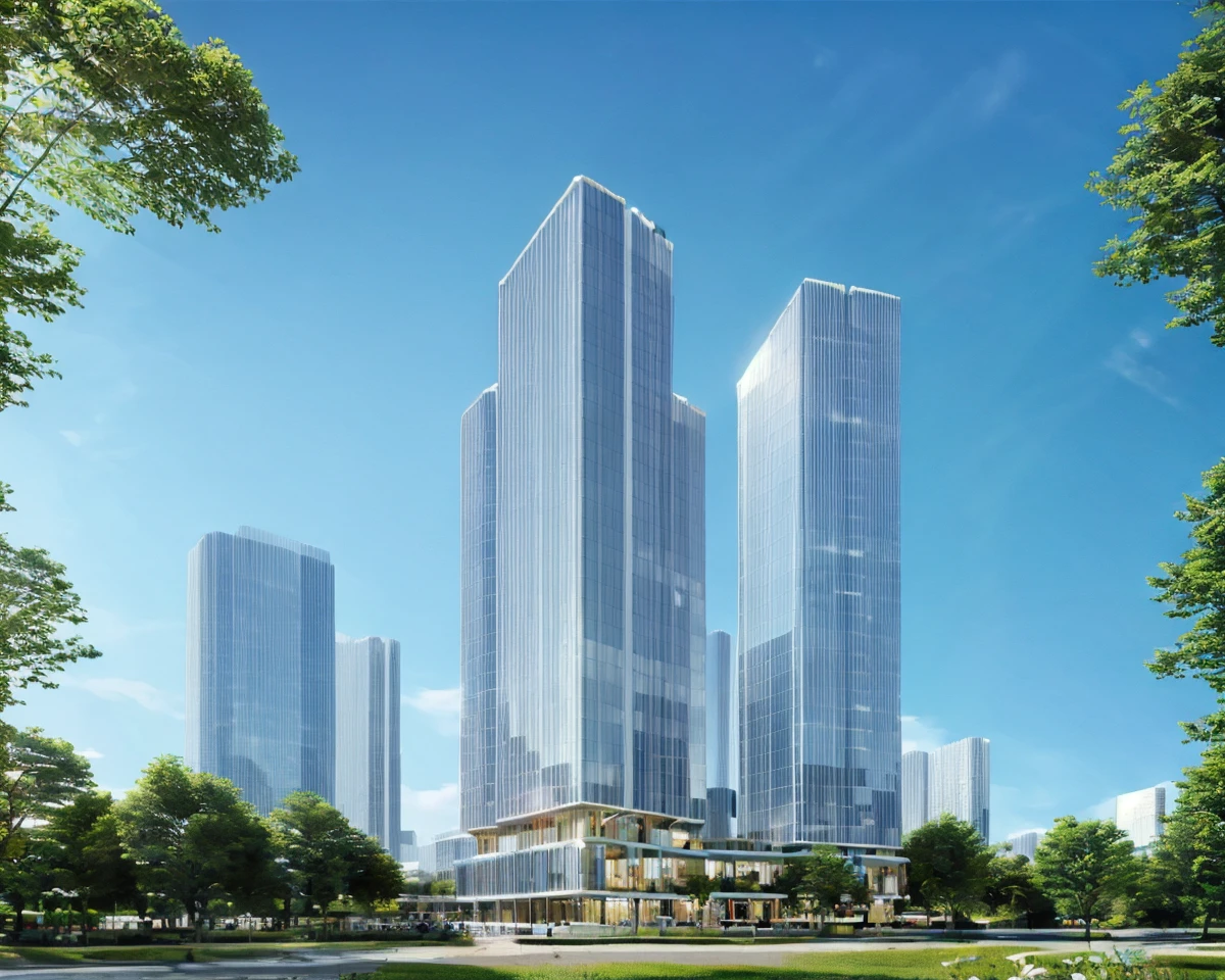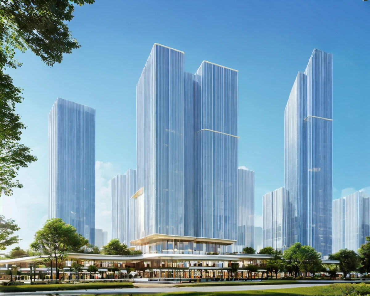 效果图风格的建筑日景,适合于商业建筑、高层建筑等公共建筑的表达,配合controlnet能快速出概念图。