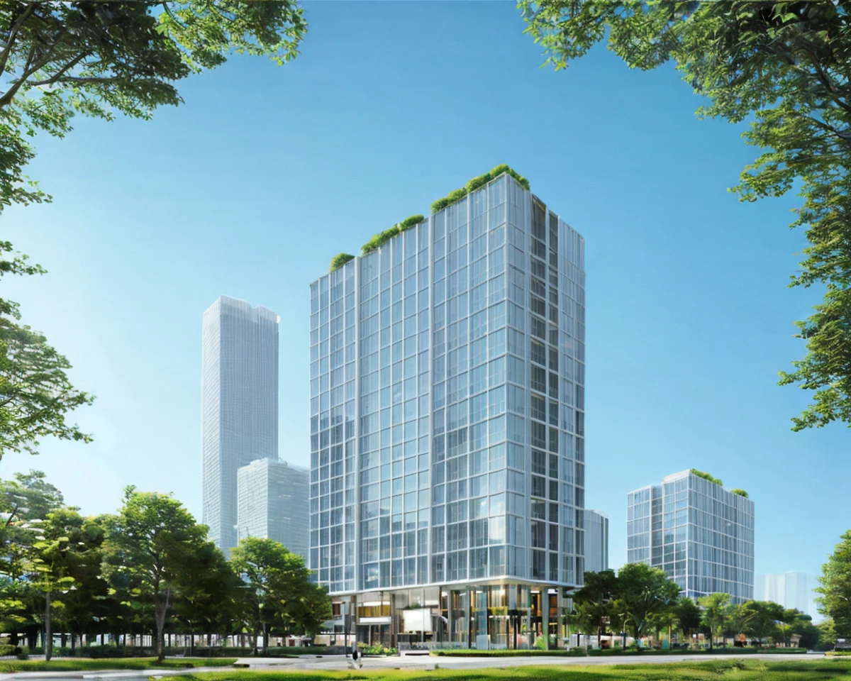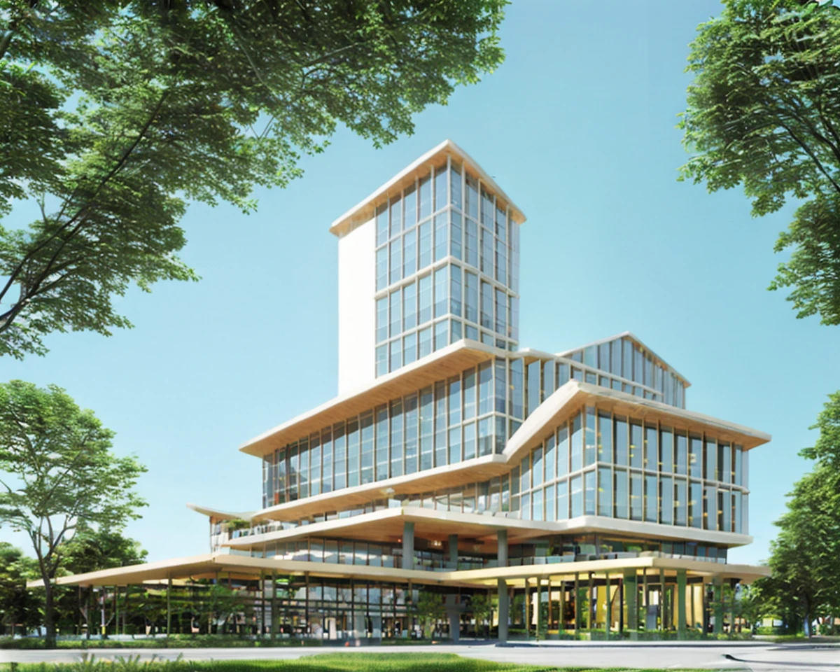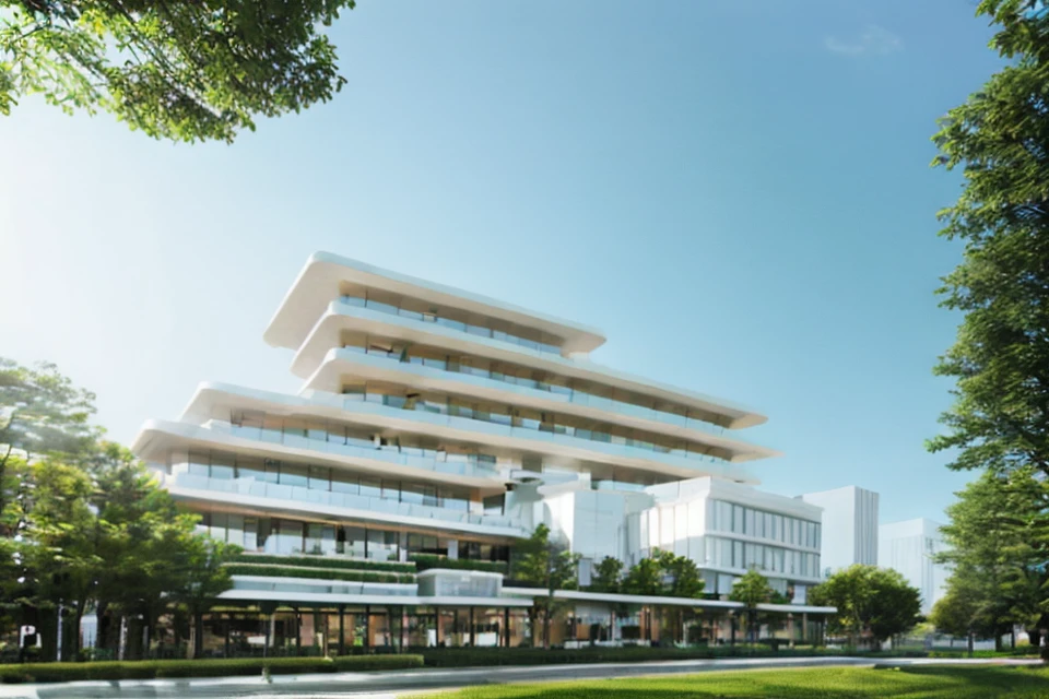 效果图风格的建筑日景,适合于商业建筑、高层建筑等公共建筑的表达,配合controlnet能快速出概念图。