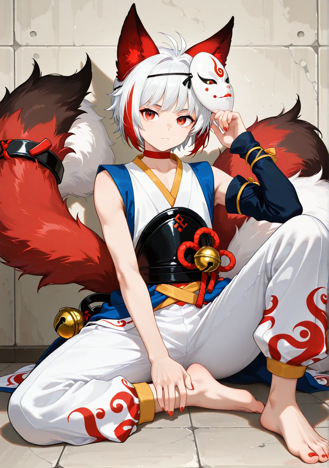 hakuzousu, animal_ears, fox_ears, red_eyes, fox_boy, unevolved, white_hair, two_tails, red_nails, mask_on_head, nail polish, single sleeve, barefoot, jingle bell, red_choker, short hair, tail ornament, streaked hair, body fur