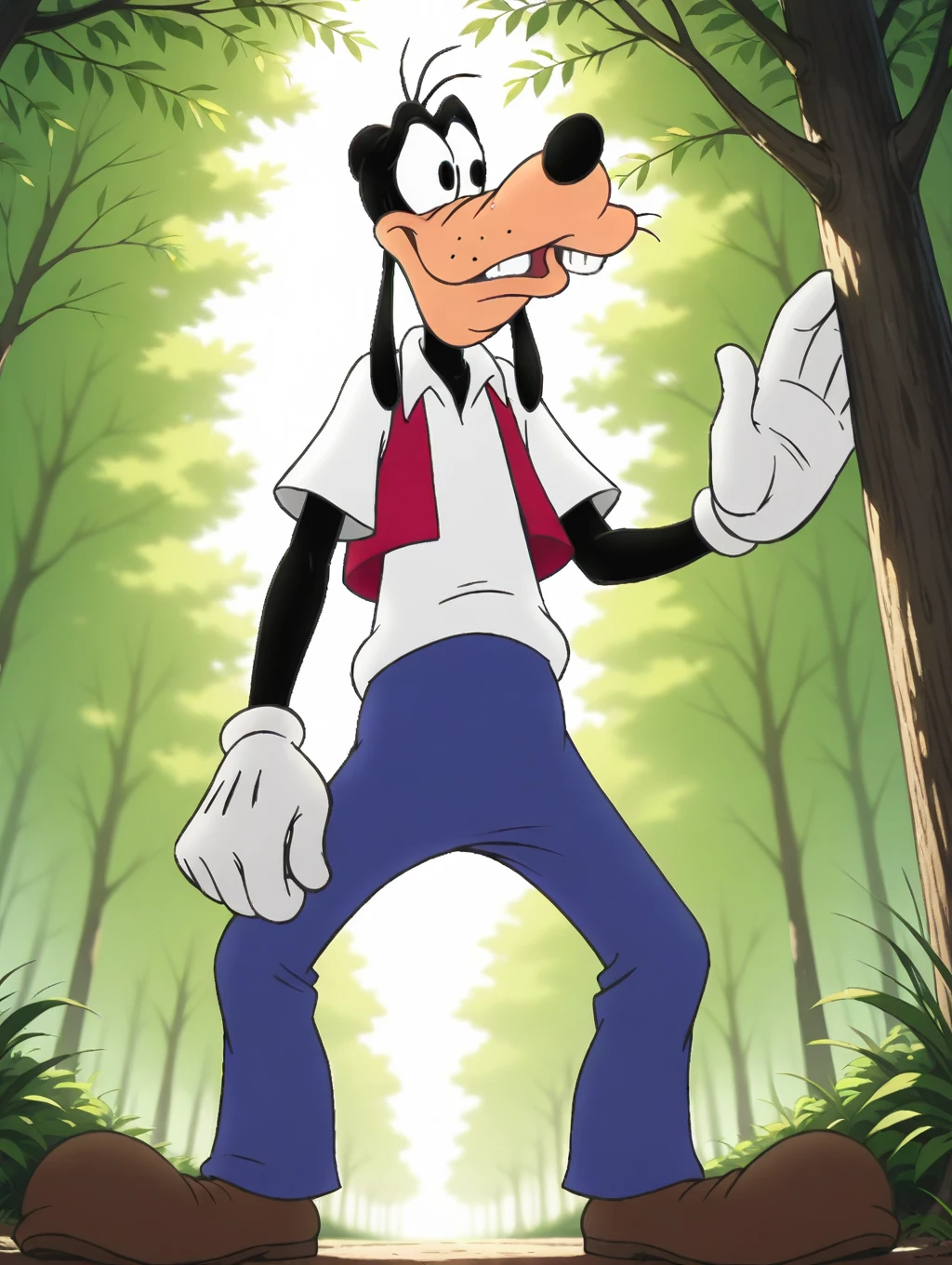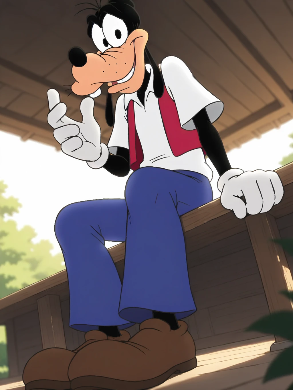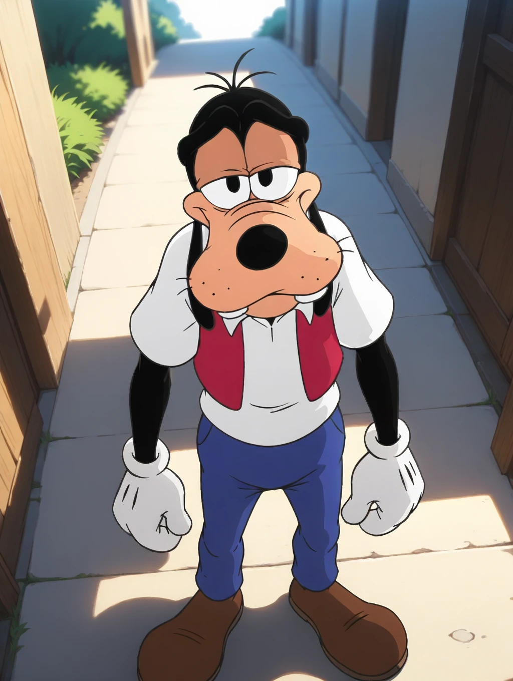 <lora:Goofy-Illustrious:1>,goofy-goof, solo, 1boy, male focus, gloves, full body, furry male, blue pants, brown shoes,white shirt, red vest,(Male:1.6),contrapposto,from below, looking at viewer,