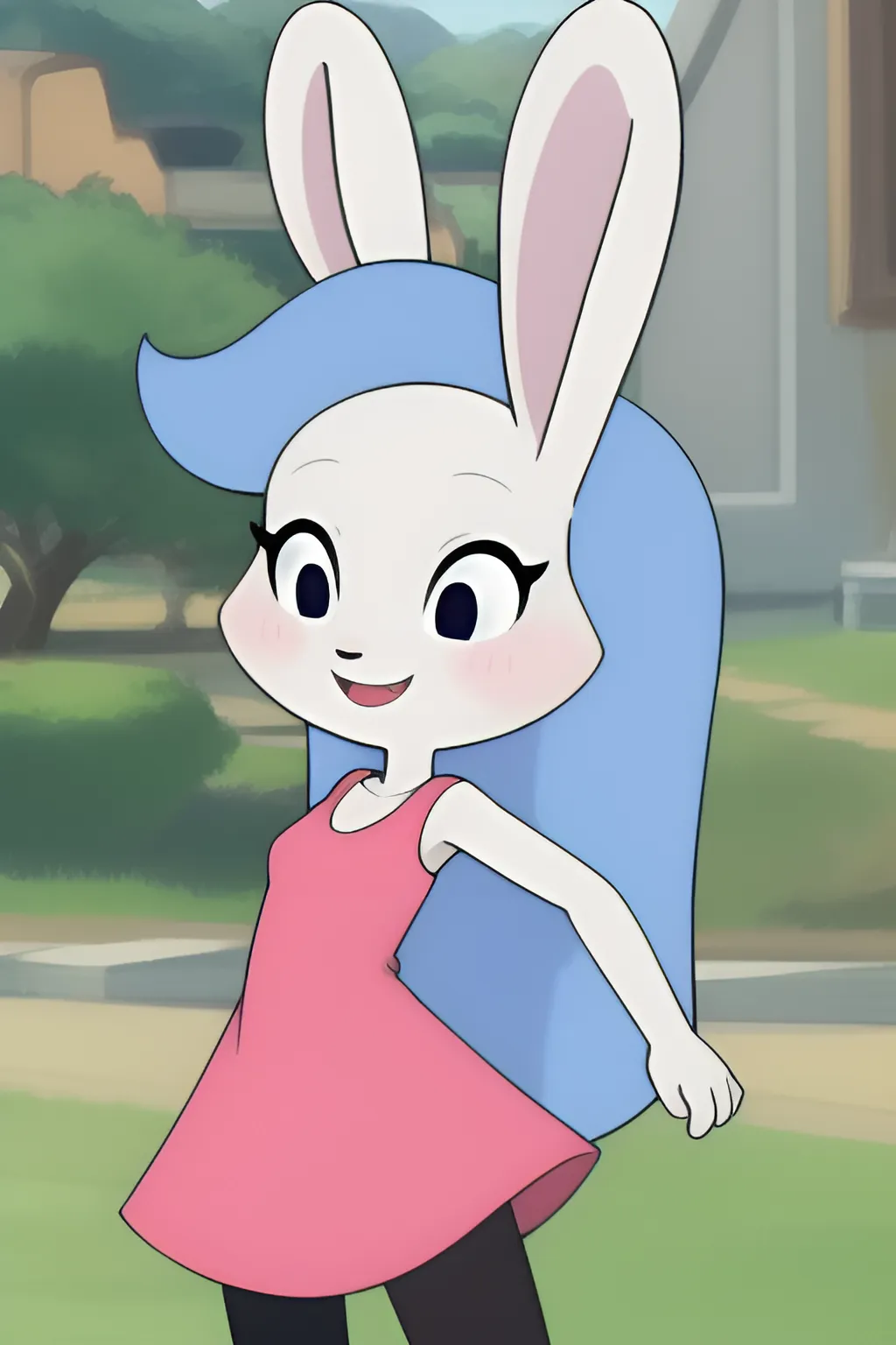 ExDoozy, rabbit girl, white fur, rabbit ears, pink dress, black leggings, blue hair