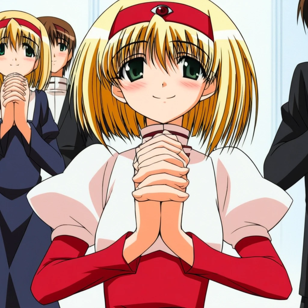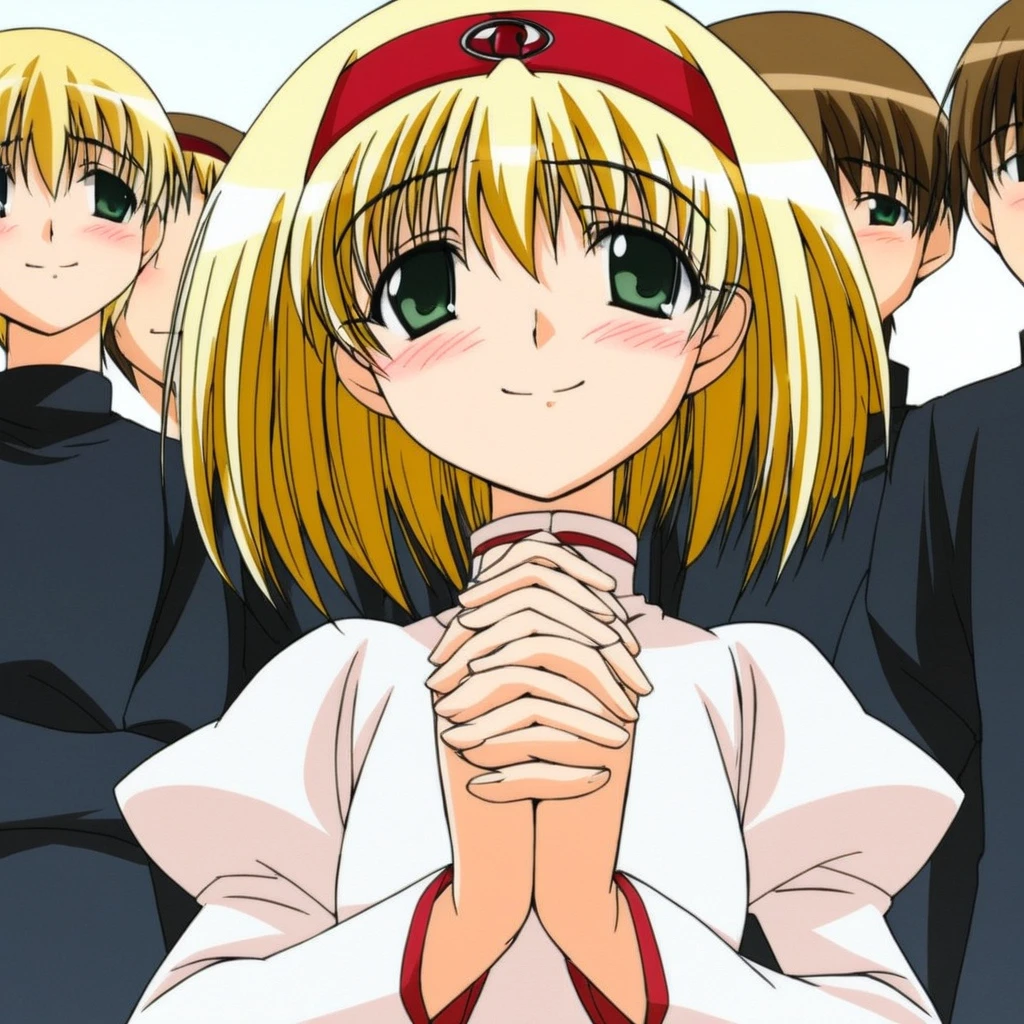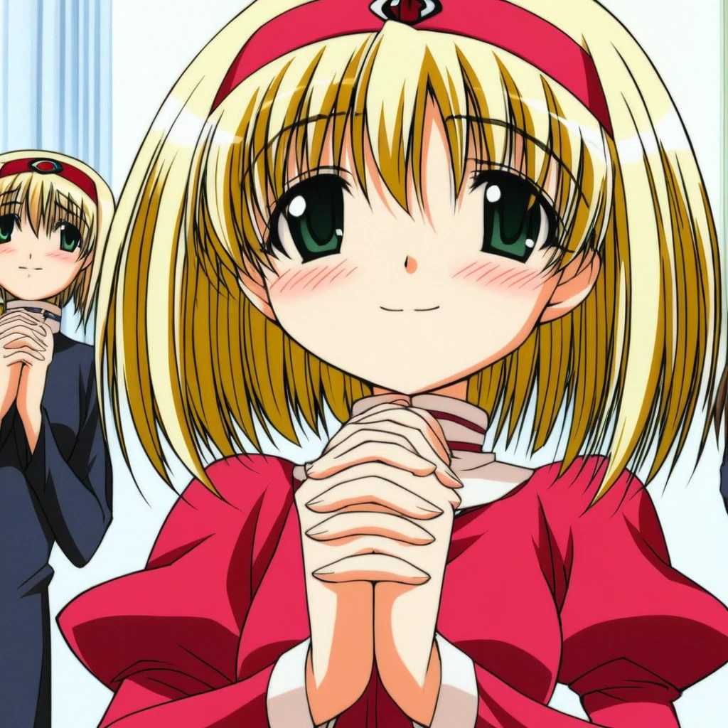 green eyes, dress, blonde hair, hairband, own hands together, own hands clasped, 1girl, blush, smile, short hair