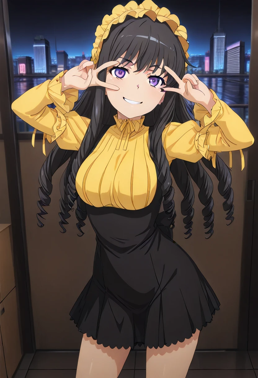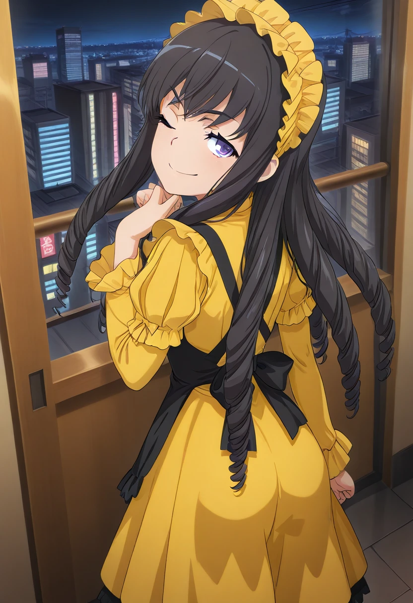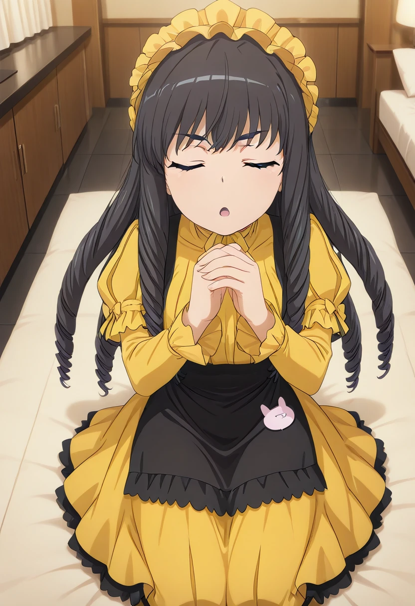 black hair, long hair, drill hair, maid headdress, yellow dress, maid, long dress, long sleeves, apron,