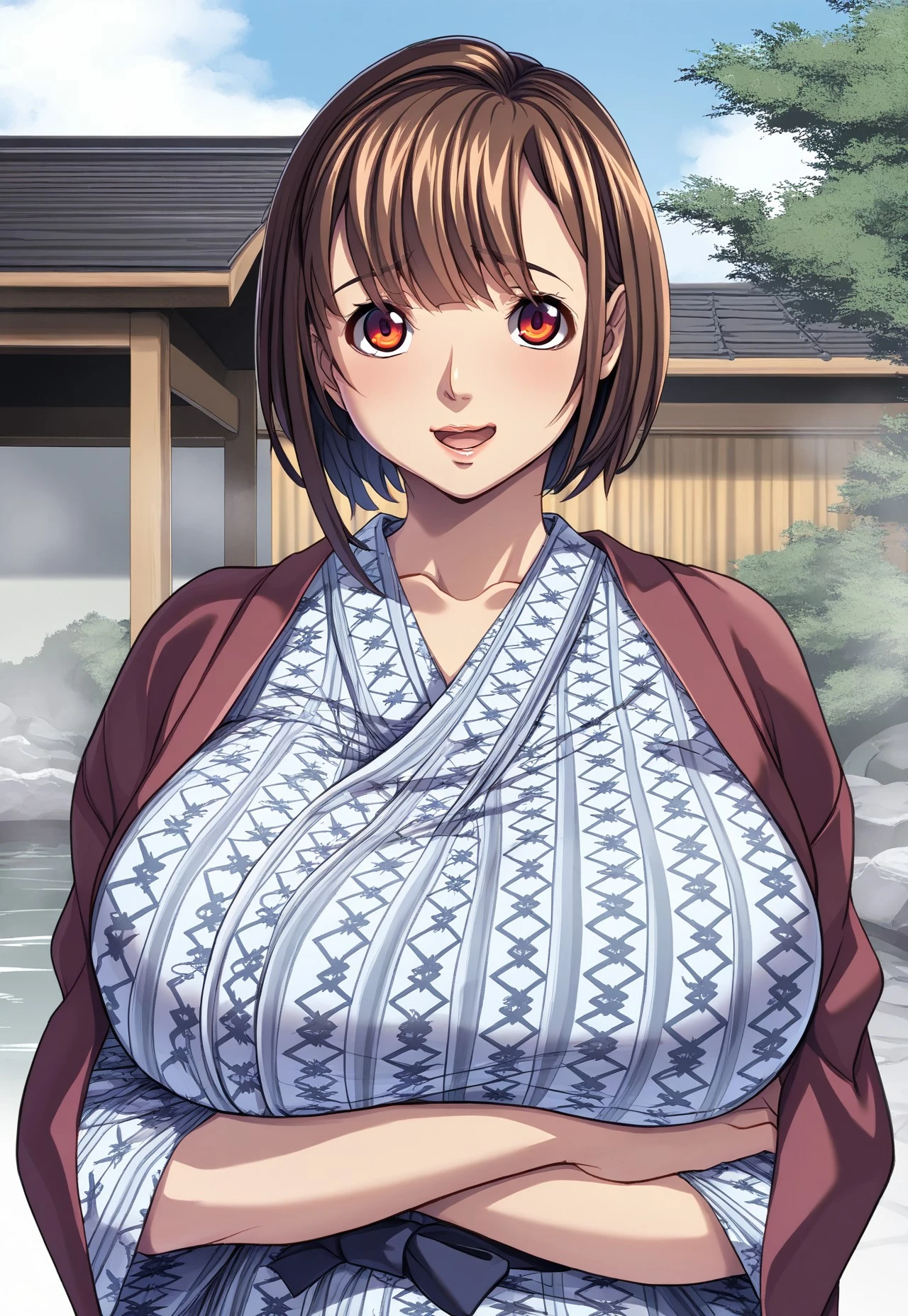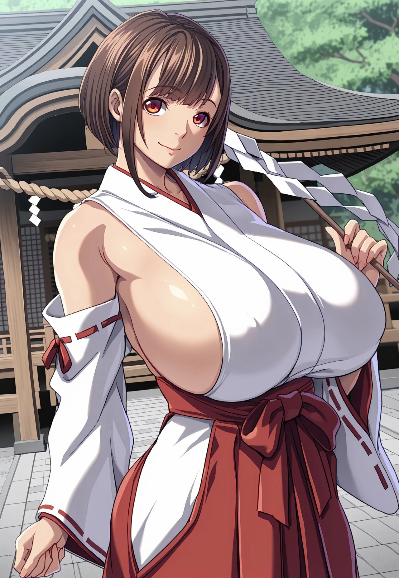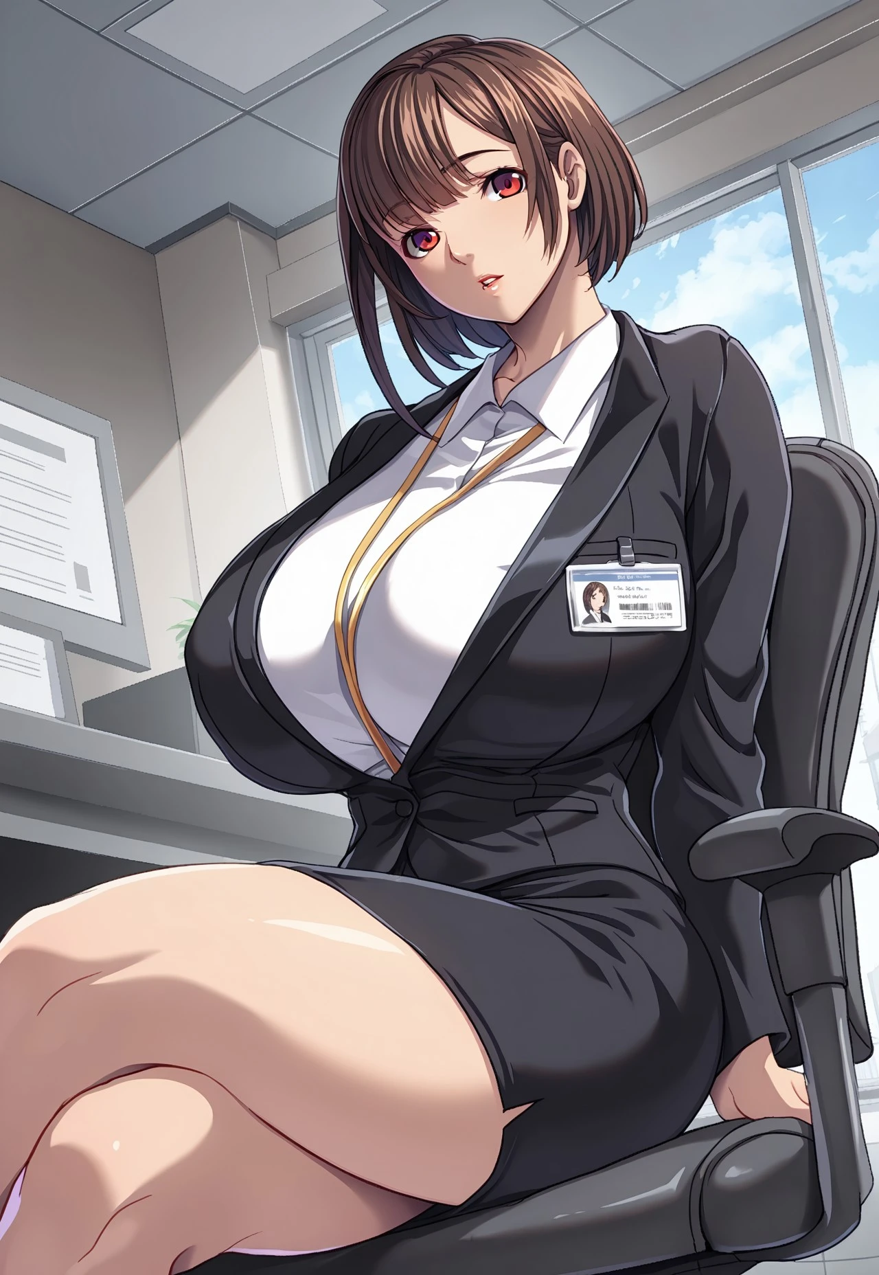 kazekawahikaru, short hair, brown hair, asymmetrical sidelocks, red eyes, huge breasts