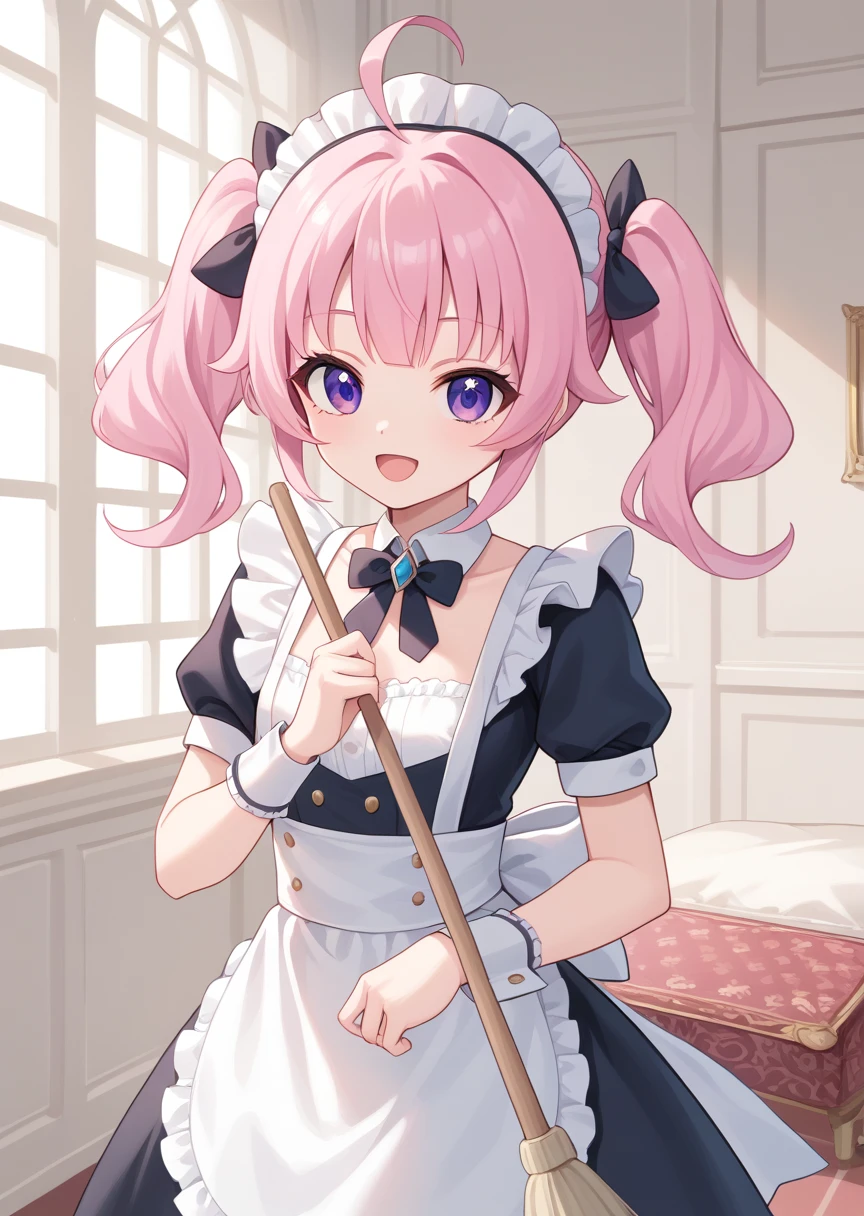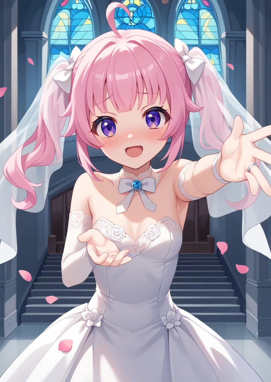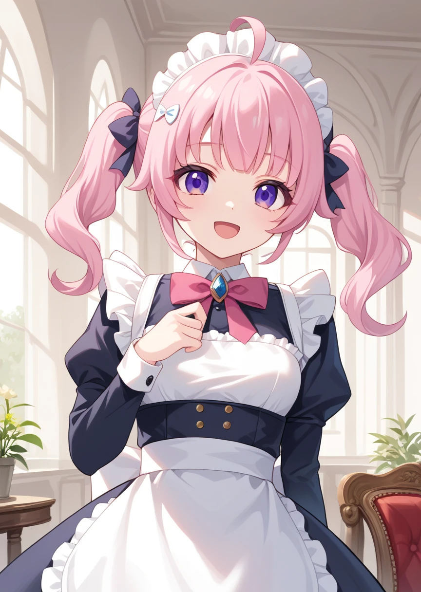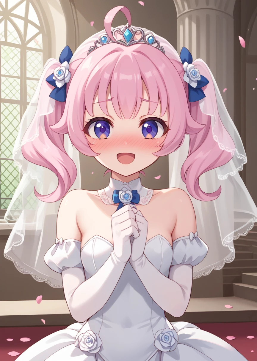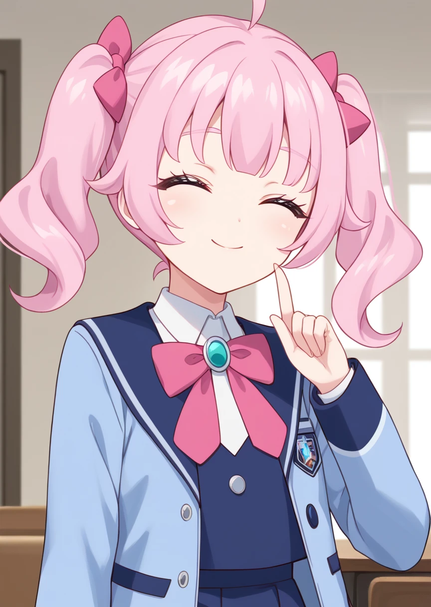 Optional: shirt, long sleeves, bow, school uniform, jacket, white shirt, hair bow, open clothes, collared shirt, bowtie, open jacket, pink bow, blue jacket, brooch,