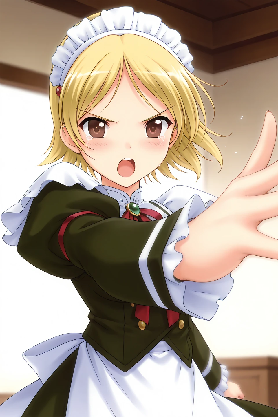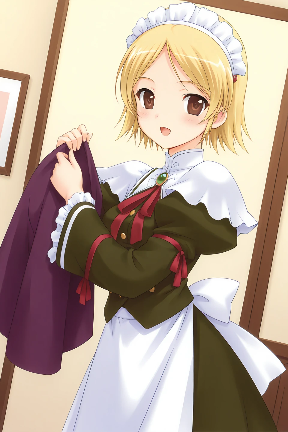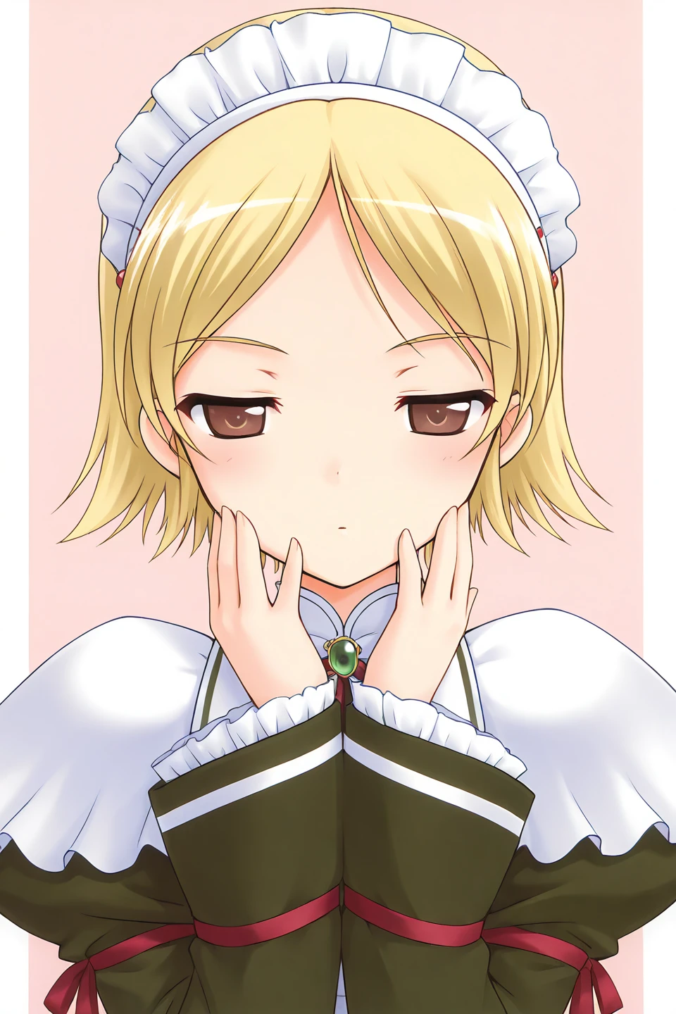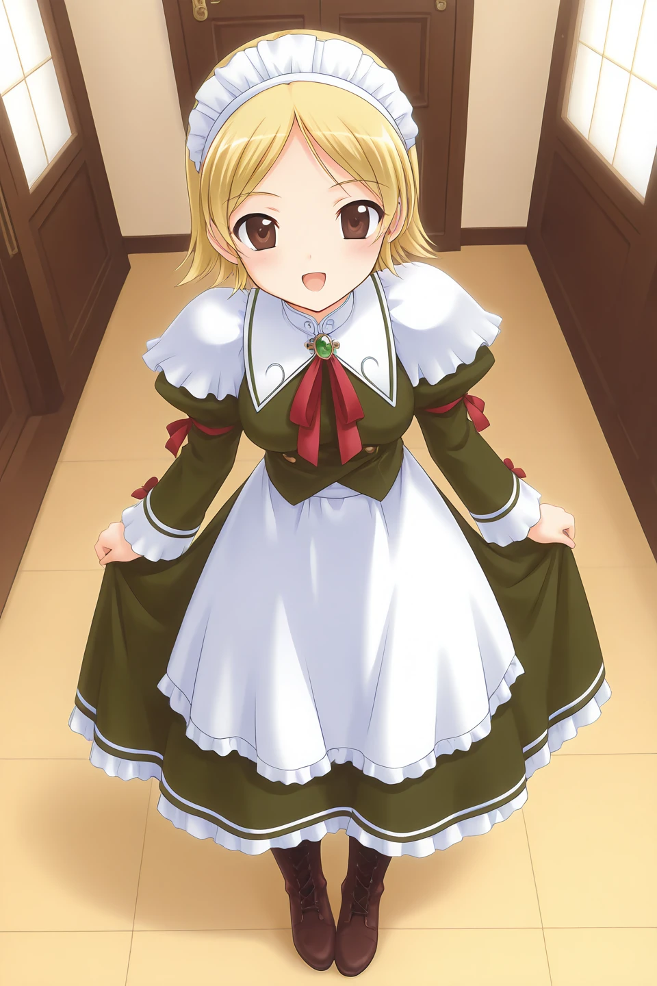 maid, maid headdress, turtleneck, sailor color, ribbon, jewelry, gem, brooch, neck ribbon, dress, green dress, long dress, buttons, capelet, frills, long sleeves, wide sleeves, frilled sleeves, puffy sleeves, juliet sleeves, arm ribbon, red ribbon, apron, white apron, waist apron, maid apron, frilled apron, shoes, boots, knee boots, lace-up boots, cross-laced footwear,