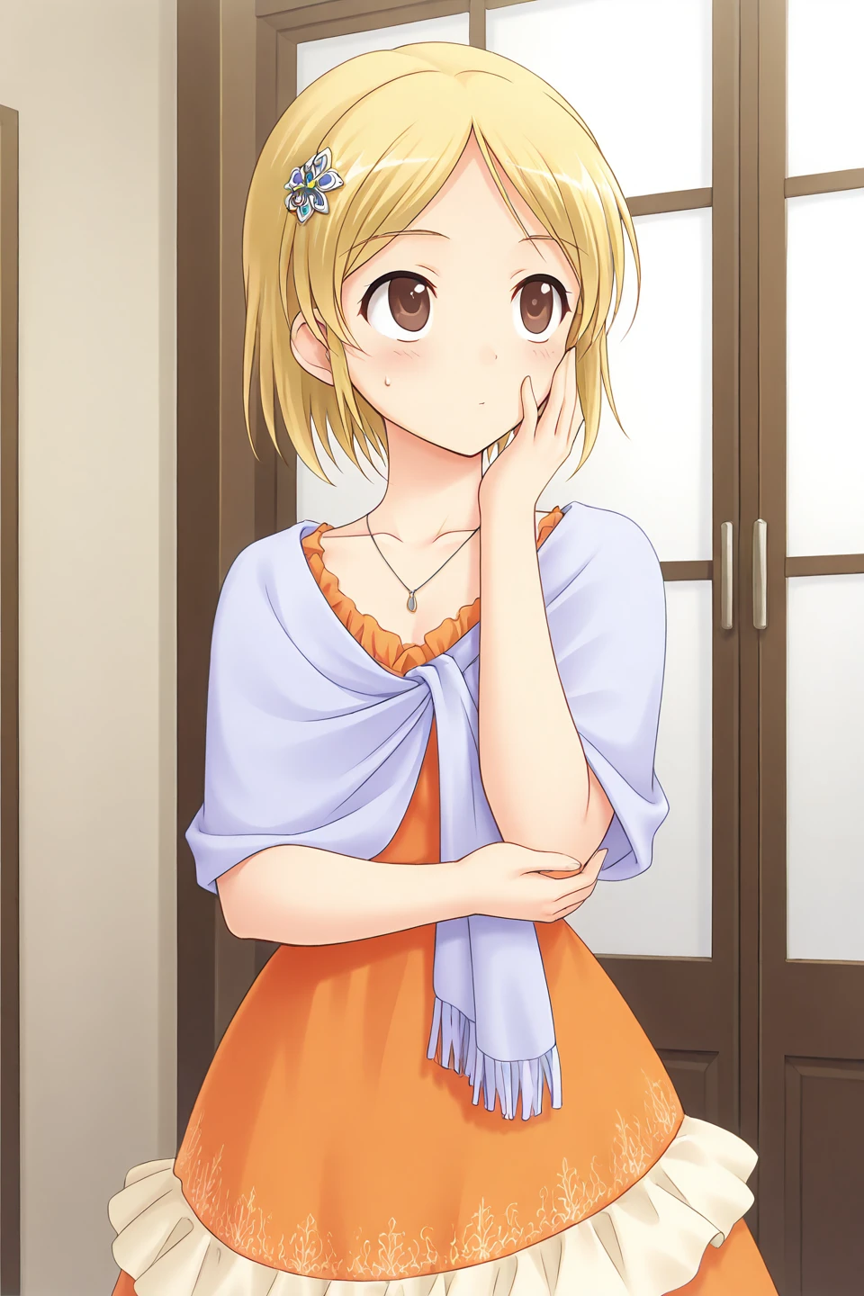 dress, orange dress, frills, shawl, hair ornament, jewelry, necklace, pendant, collarbone,